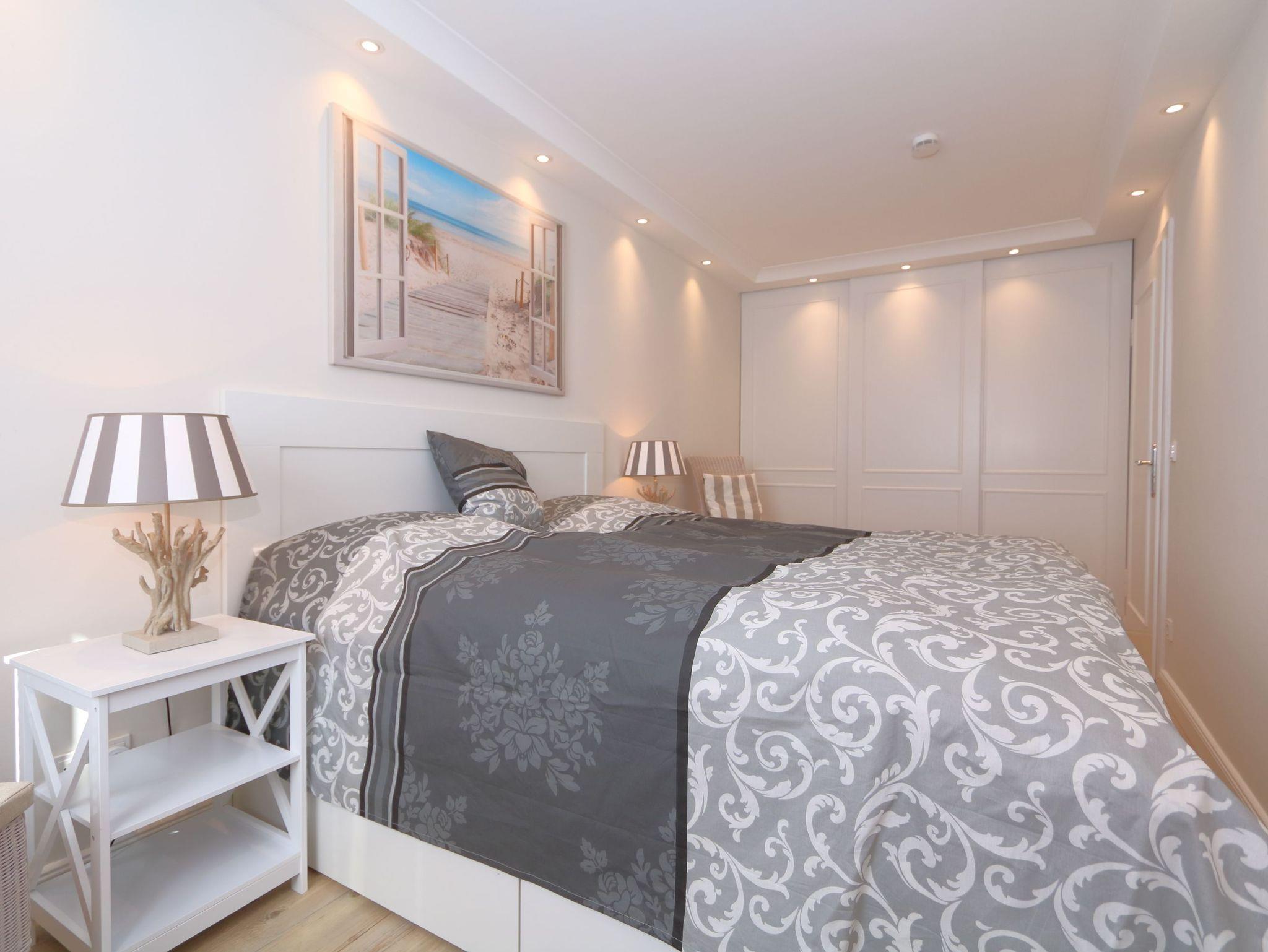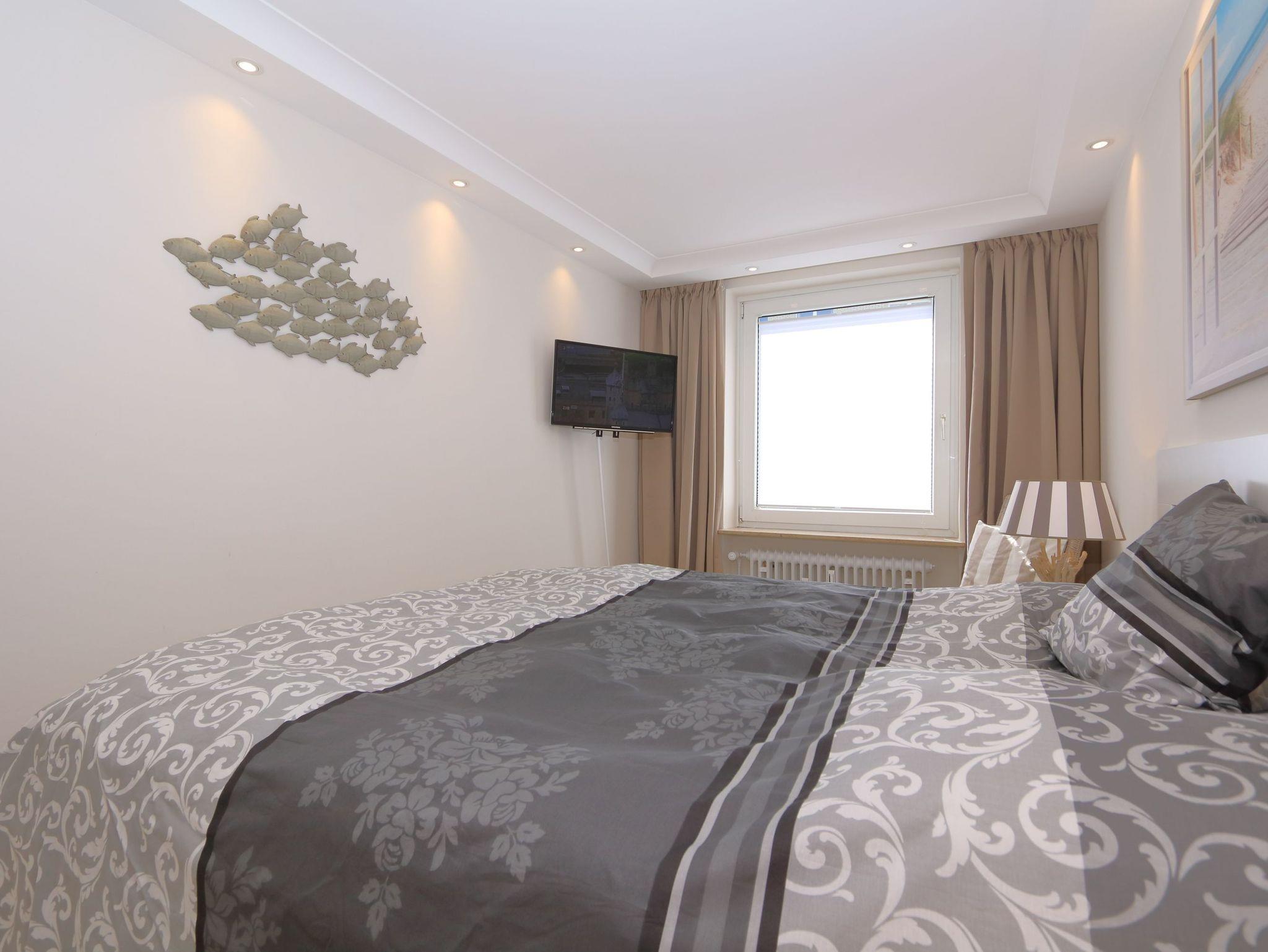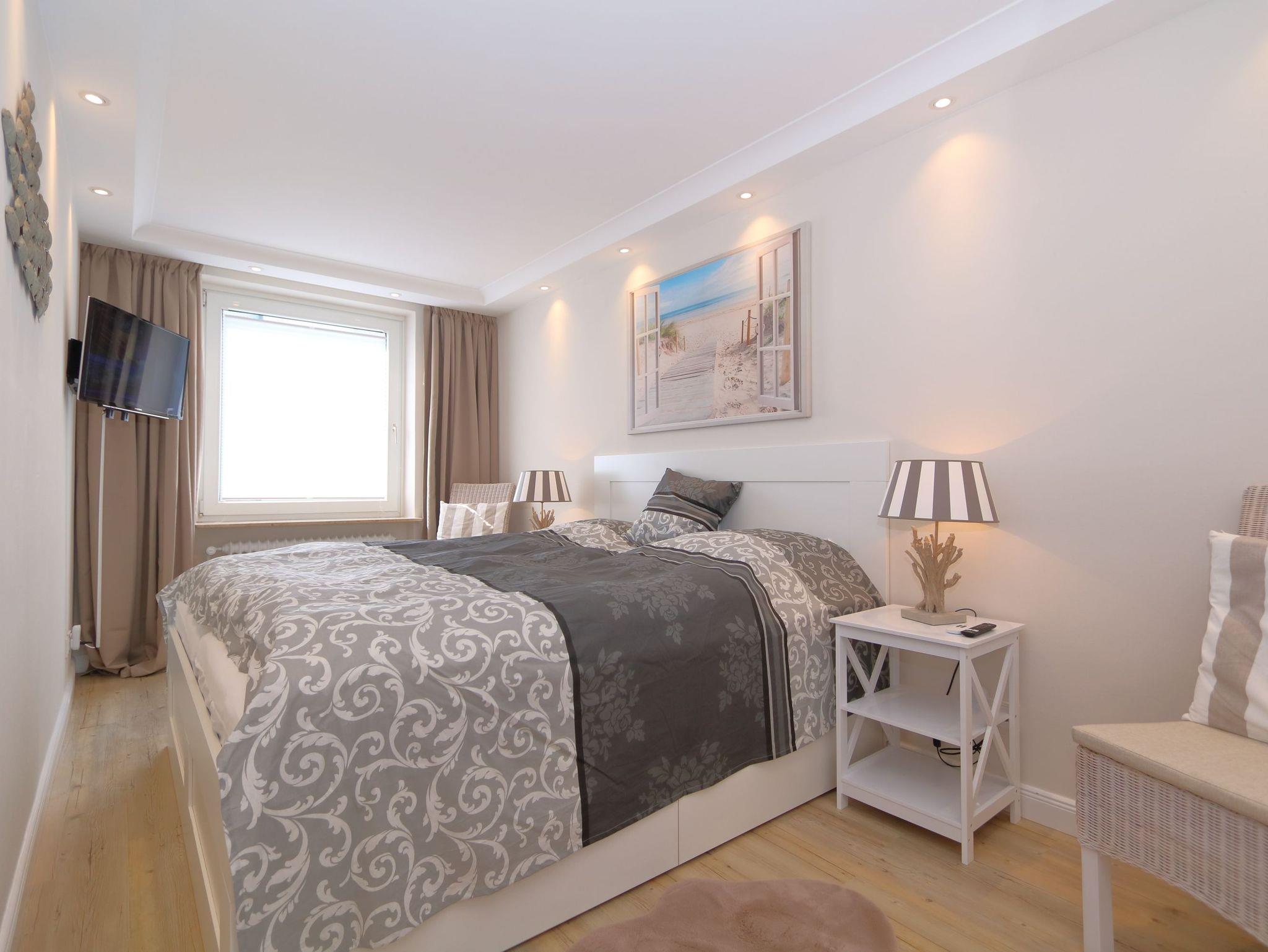 Das Schlafzimmer ist modern mit einem bequemen Doppelbett, Smart-TV und Kleiderschrank ausgestattet,