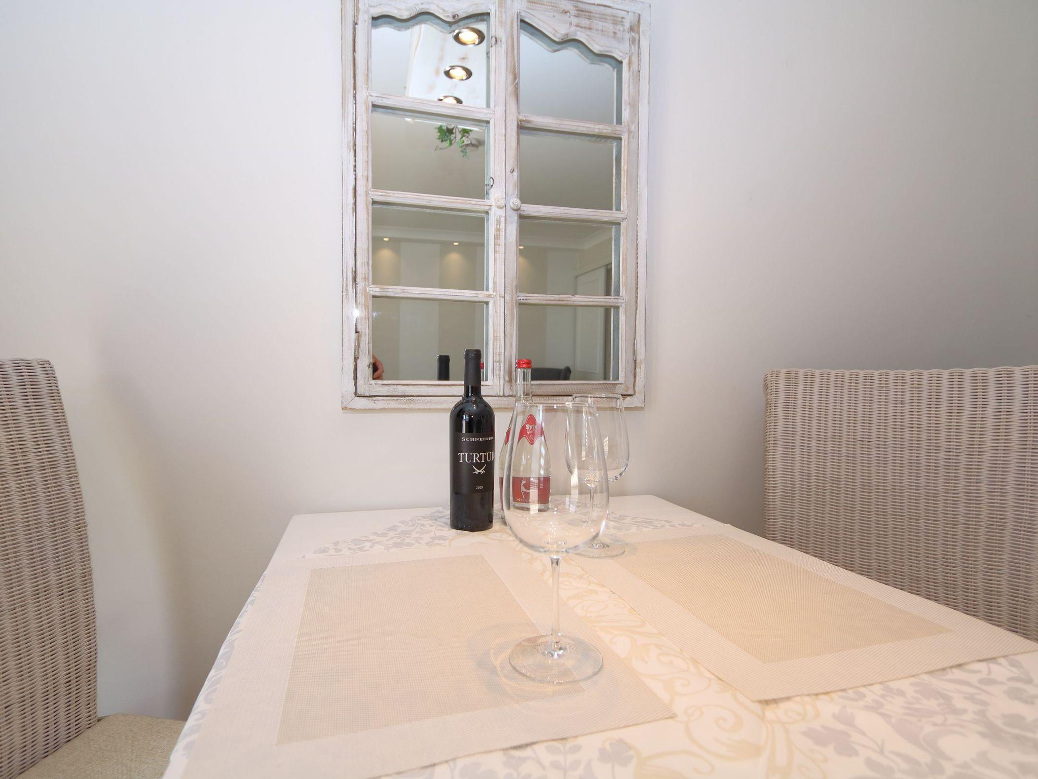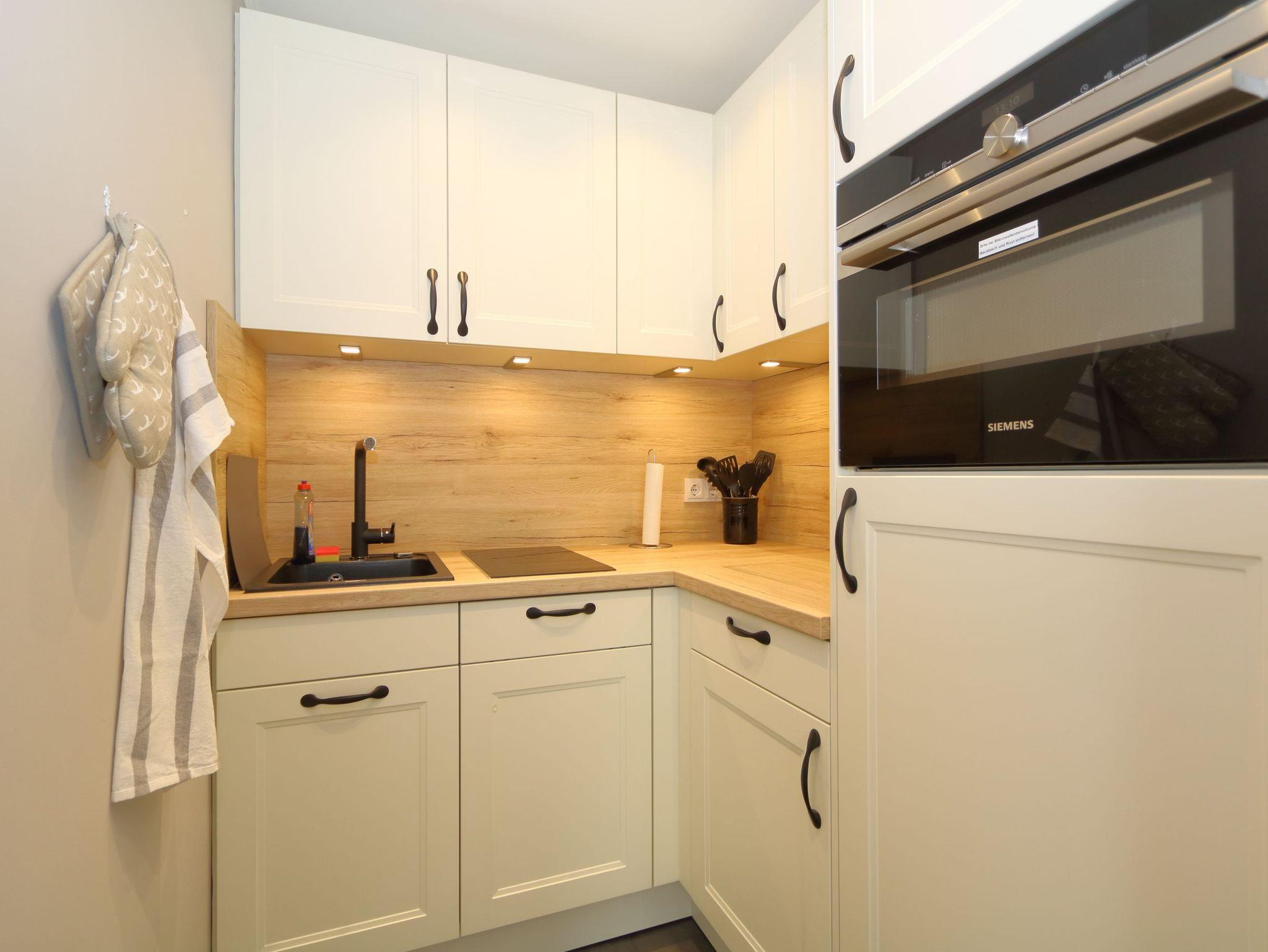 Vom Wohnzimmer aus gelangt man in eine moderne, komplett ausgestattete Küche mit Geschirrspüler, Backofen mit Microwelle, Kühlschrank mit Gefrierfach, Kapselmaschine, Wasserkocher, Kaffeemaschine,Toaster, Milchaufschäumer sowie Bügelbrett-und Eisen.