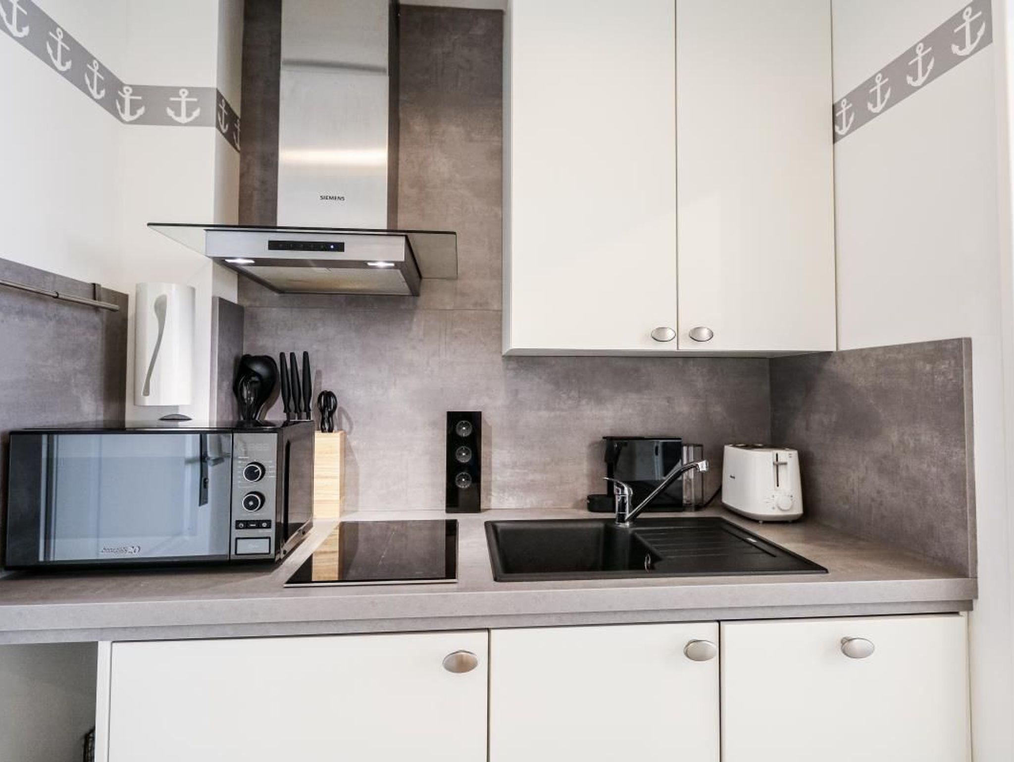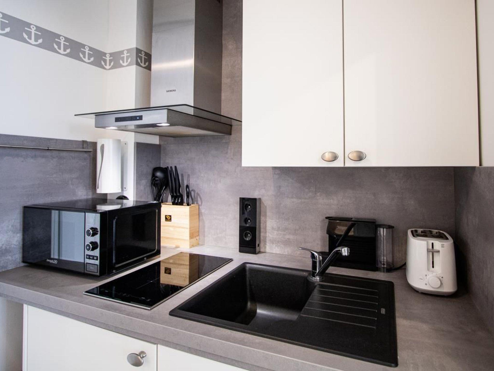 Die kleine Küchenzeile ist mit Induktionsherd, Mikrowelle mit Grillfunktion, Spülmaschine, Kühlschrank und Abzugshaube