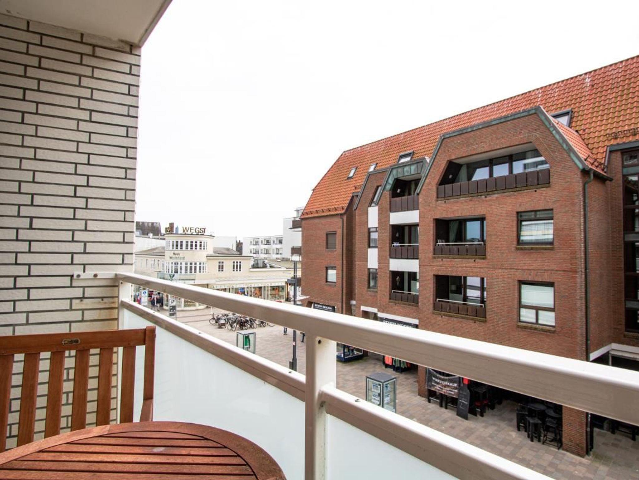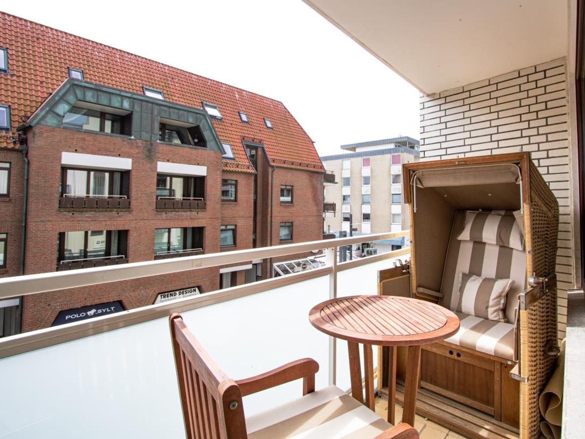 Der Balkon mit kleinem Meerblick ist möbliert mit Strandkorb, Tisch und Stühlen.