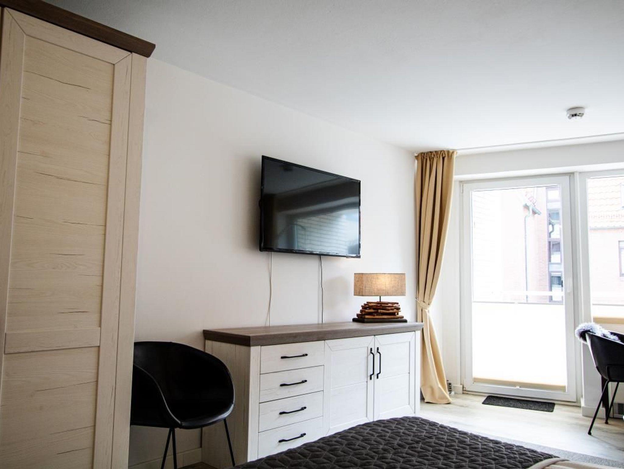 Ein großer Fernseher mit Smart-TV und ein kleines Radio sorgen für Unterhaltung.