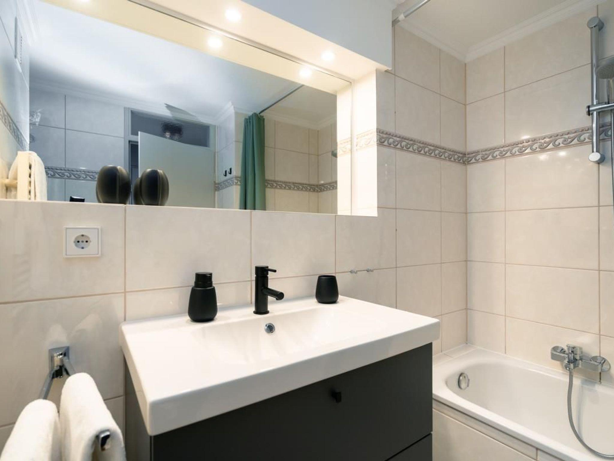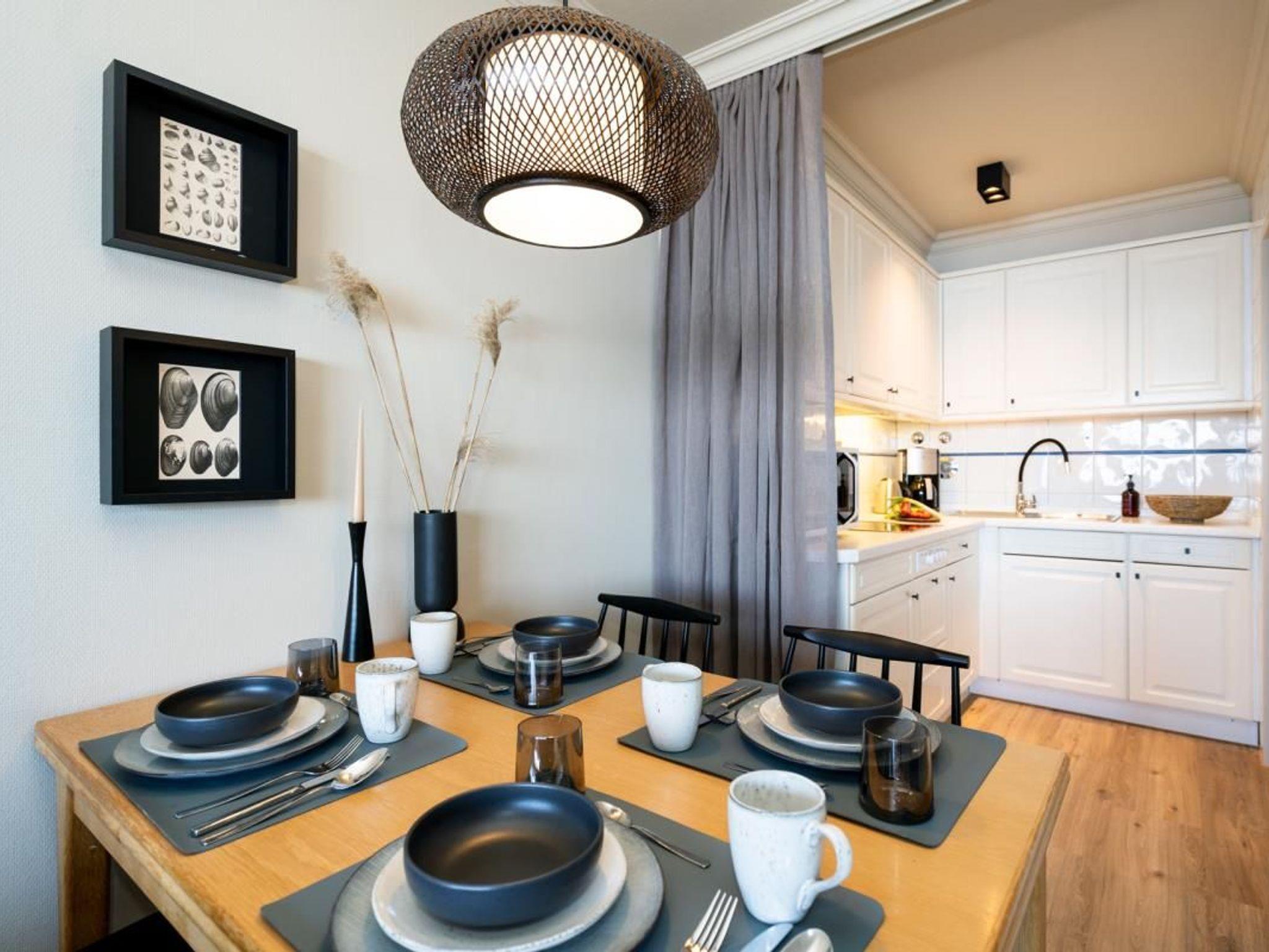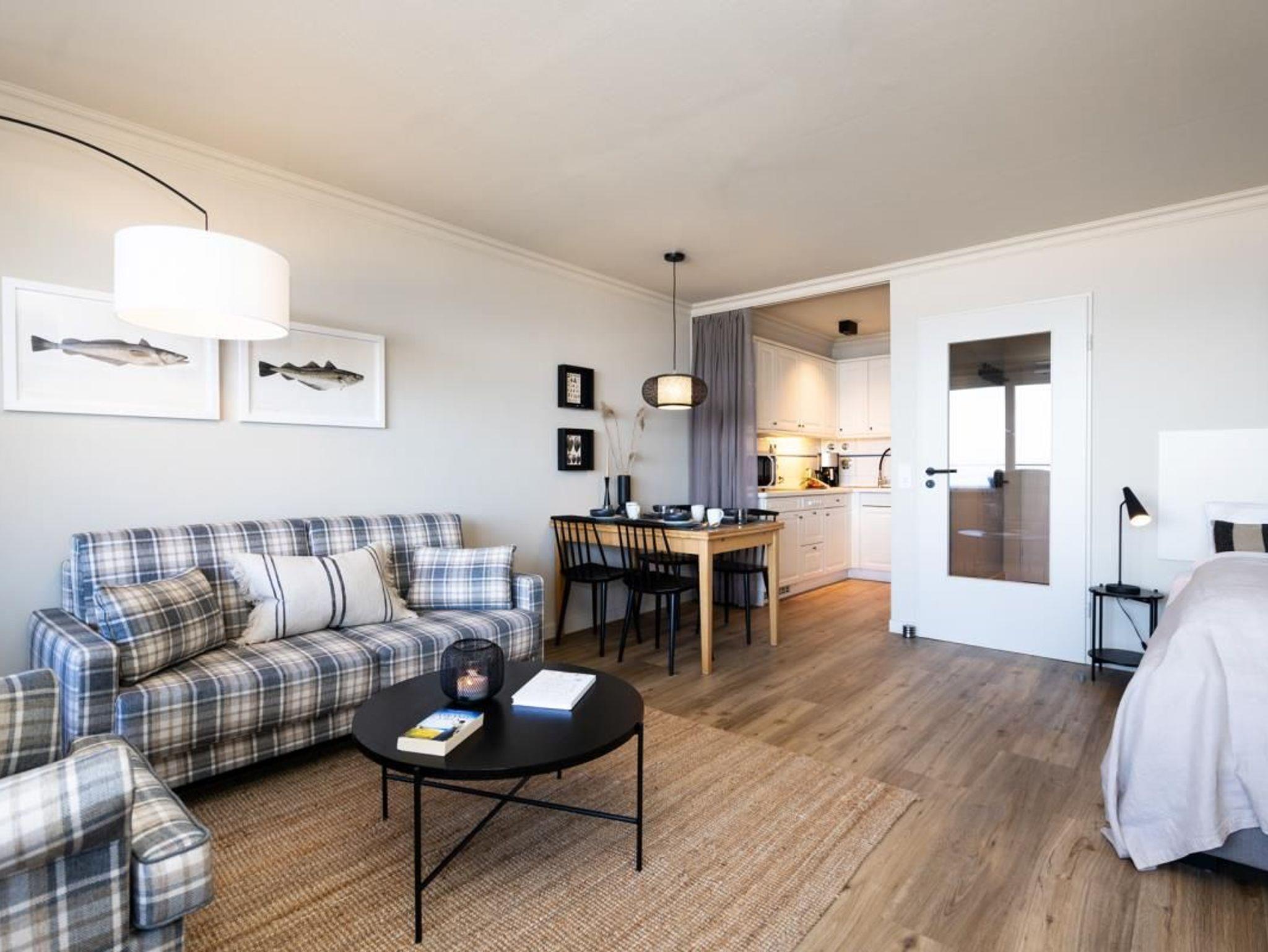 1-Zimmer-Appartement ca. 43 m² für 2 Personen. Das gut aufgeteilte Appartement verfügt über eine Küche, die nach Wunsch durch eine Tür bzw. einen Vorhang abgetrennt werden kann. Zudem hat die Ferienwohnung ein Badezimmer mit kleiner Duschwanne und mehreren Handtuchhalterungen. Durch den Flur gelangen Sie nun in den in den offenen Wohn-und Schlafbereich, der über große Fenster verfügt. Der Westbalkon ermöglicht es Ihnen, den Strand und das Meer über das Flachdach gut zu sehen. Zusätzlich kann man das Hotel Miramar und die Kurmuschel erkennen.