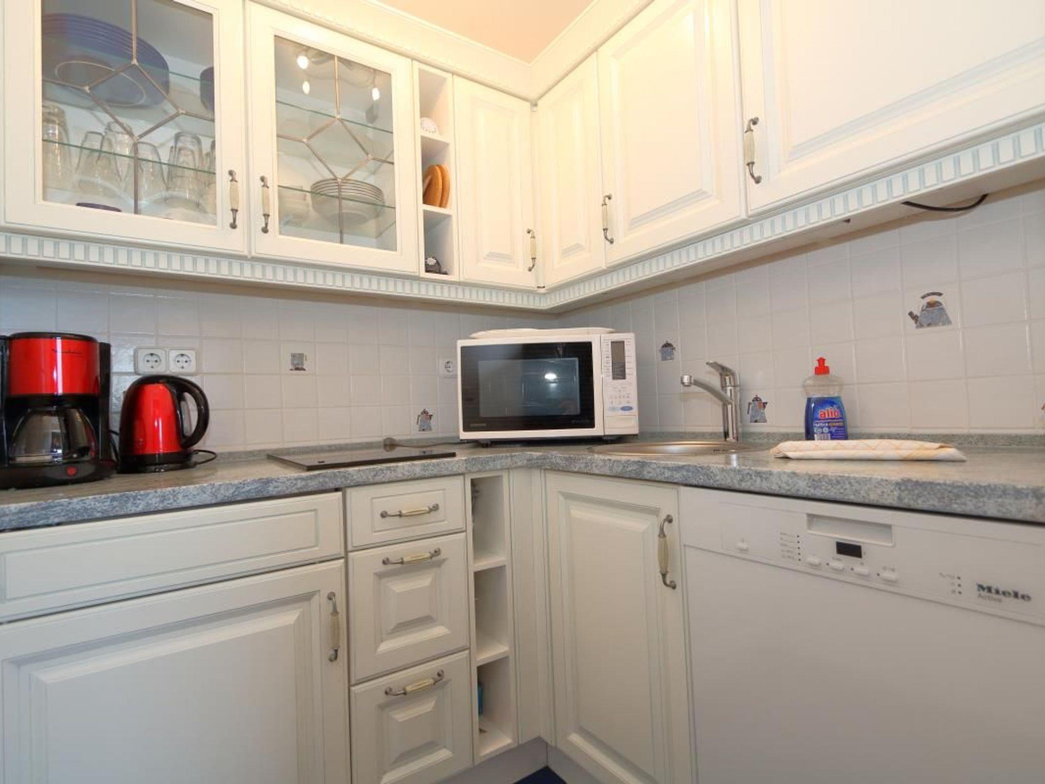 moderne, voll ausgestattete Küche mit Ceranfeld, Backofen, Mikrowelle, Spülmaschine, Kühlschrank mit Eisfach, Filter-Kaffeemaschine, Wasserkocher und Toaster.