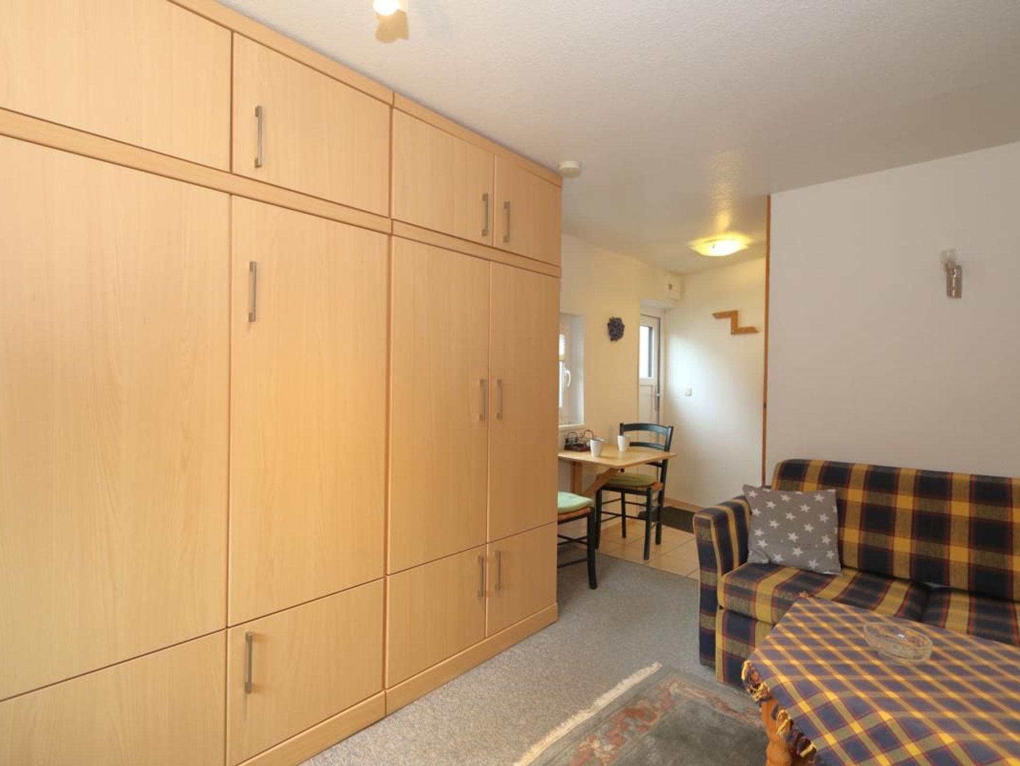 Das Appartement Maike für bis zu 2 Personen liegt im Erdgeschoß. Im Wohnbereich finden Sie eine Couchgarnitur und das Schrankbett.