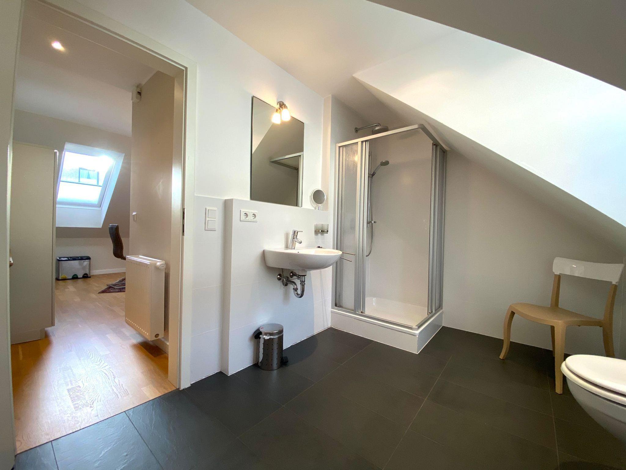 Das moderne Badezimmer ist mit einer Rainshower-Dusche, einem Handtuchwärmer, WC, Waschbecken und einem Haartrockner ausgestattet. Ein Außenfenster sorgt für frische Luft und natürliches Licht.