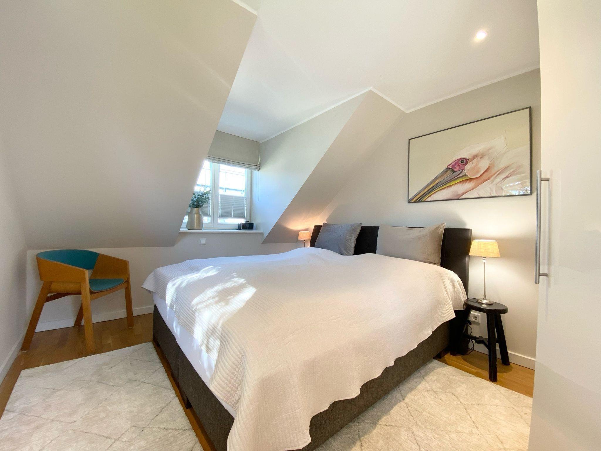 Im Schlafzimmer erwartet Sie ein komfortables Boxspringbett (180x200 cm) mit offenem Fußende, perfekt für einen tiefen und erholsamen Schlaf. Nachttische mit Leselampen und ein Kleiderschrank vervollständigen die Ausstattung.