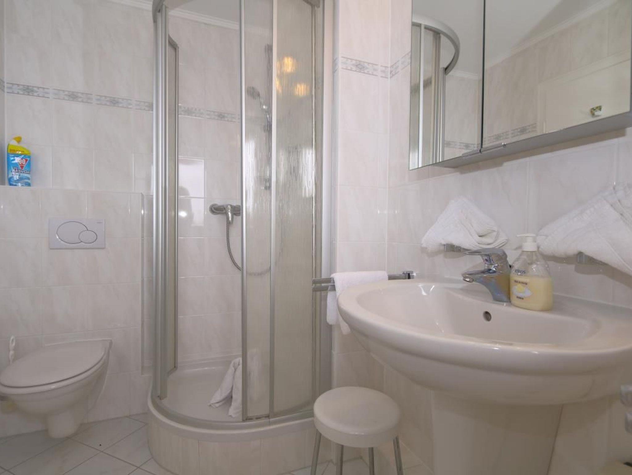 Tageslicht-Badezimmer mit Dusche, WC, Waschtisch.