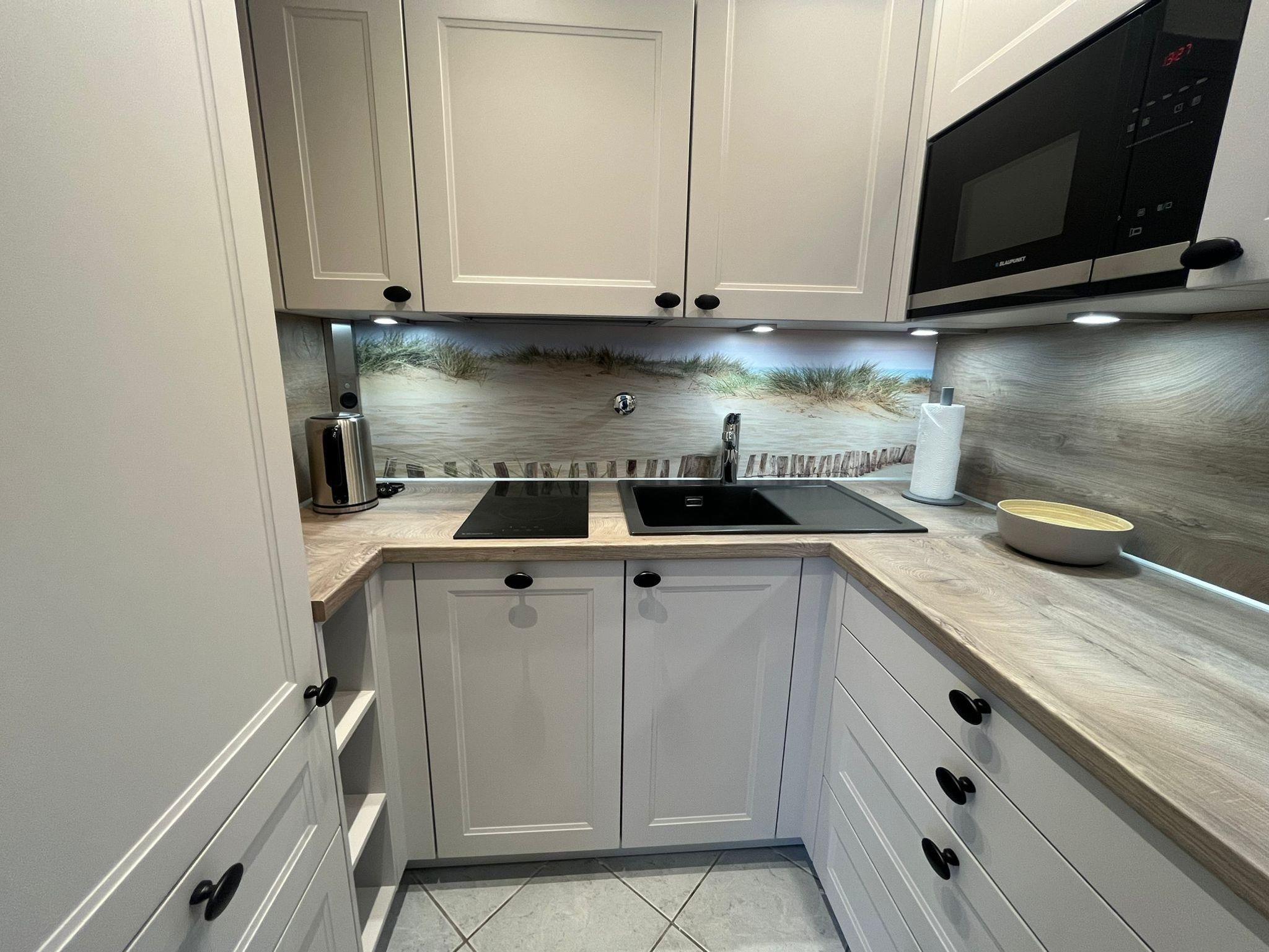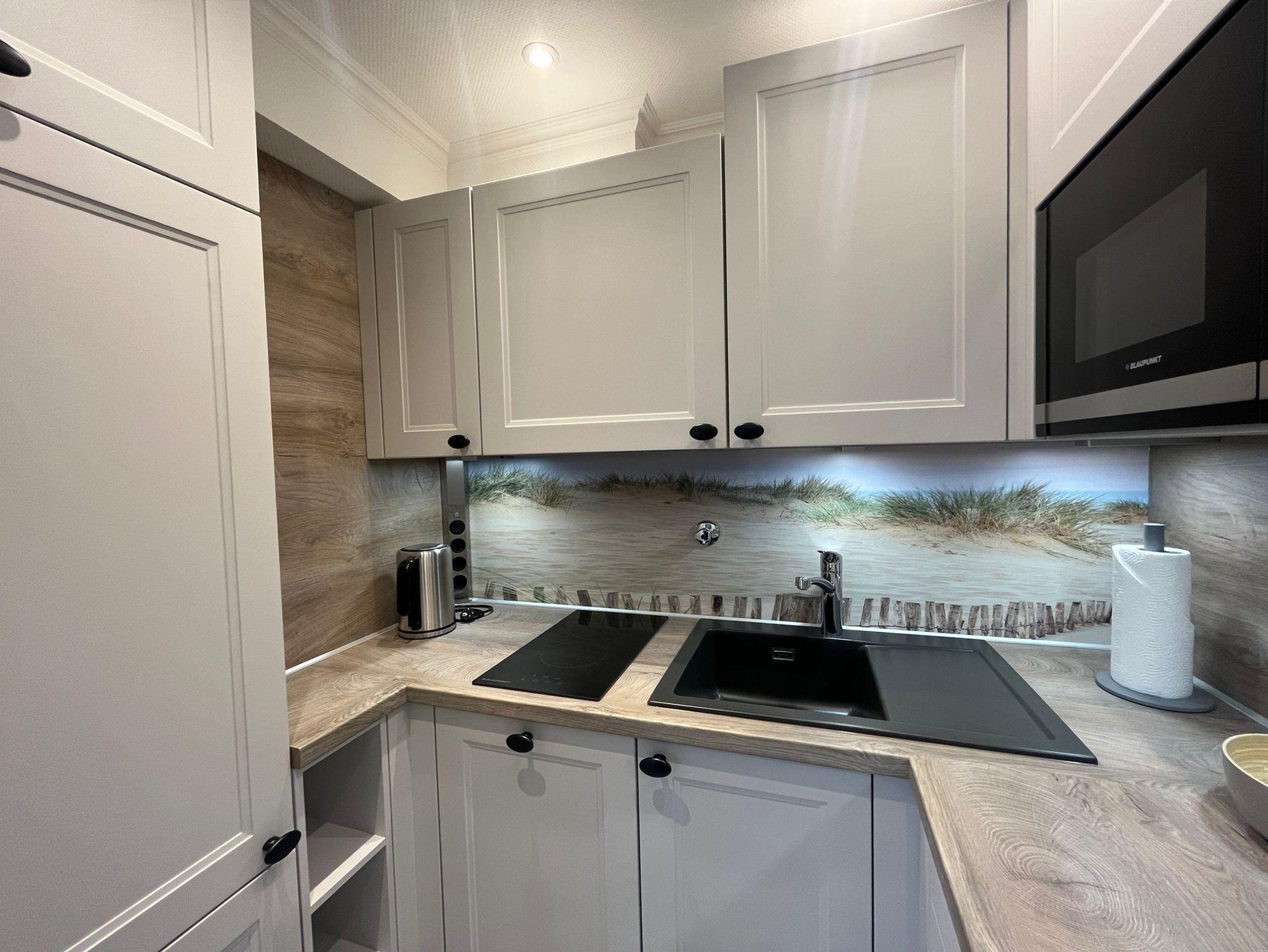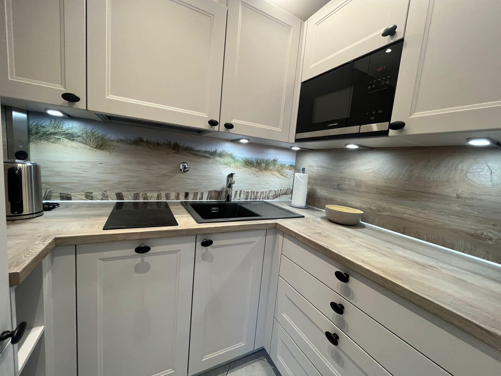 Die moderne Küchennische ist eingerichtet mit 2-Platten Cerankochfeld, Spülmaschine, Mikrowellen/ Backofenkombi, Kühlschrank mit Gefrierfach und neuen Küchenutensilien. Eine Filterkaffeemaschine sowie Senseo Kaffeepadmaschine, Wasserkocher, Toaster und Geschirr für den täglichen Bedarf sind selbstverständlich.