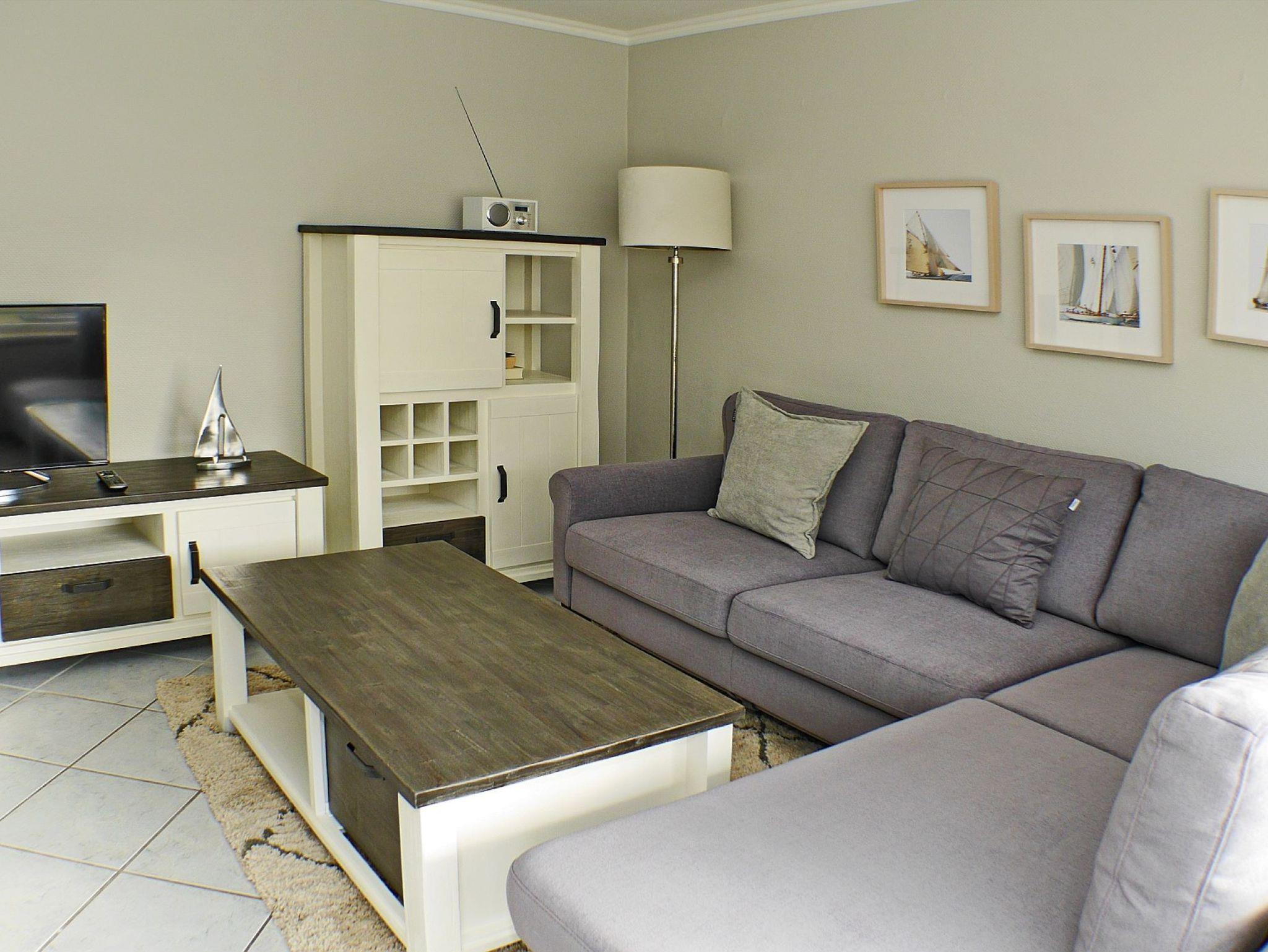 Ein gemütliches Wohnzimmer mit Couchgarnitur, Flachbild-TV und Essecke ist der Mittelpunkt der Wohnung.
