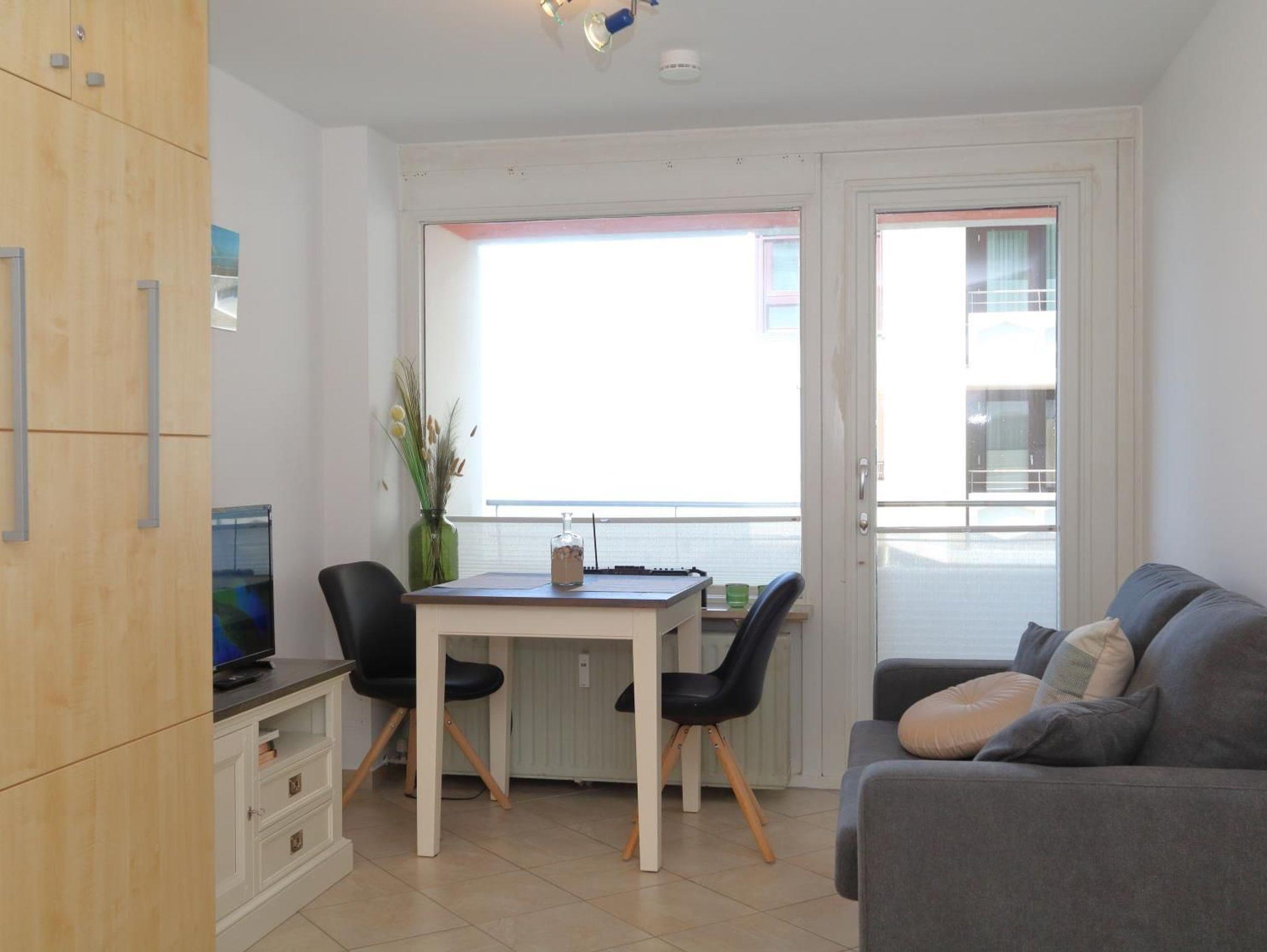 Das Appartement ist ausgestattet mit u.a. einem Schrankbett und Westbalkon, Küchenzeile im Flur und ein Badezimmer mit Dusche.