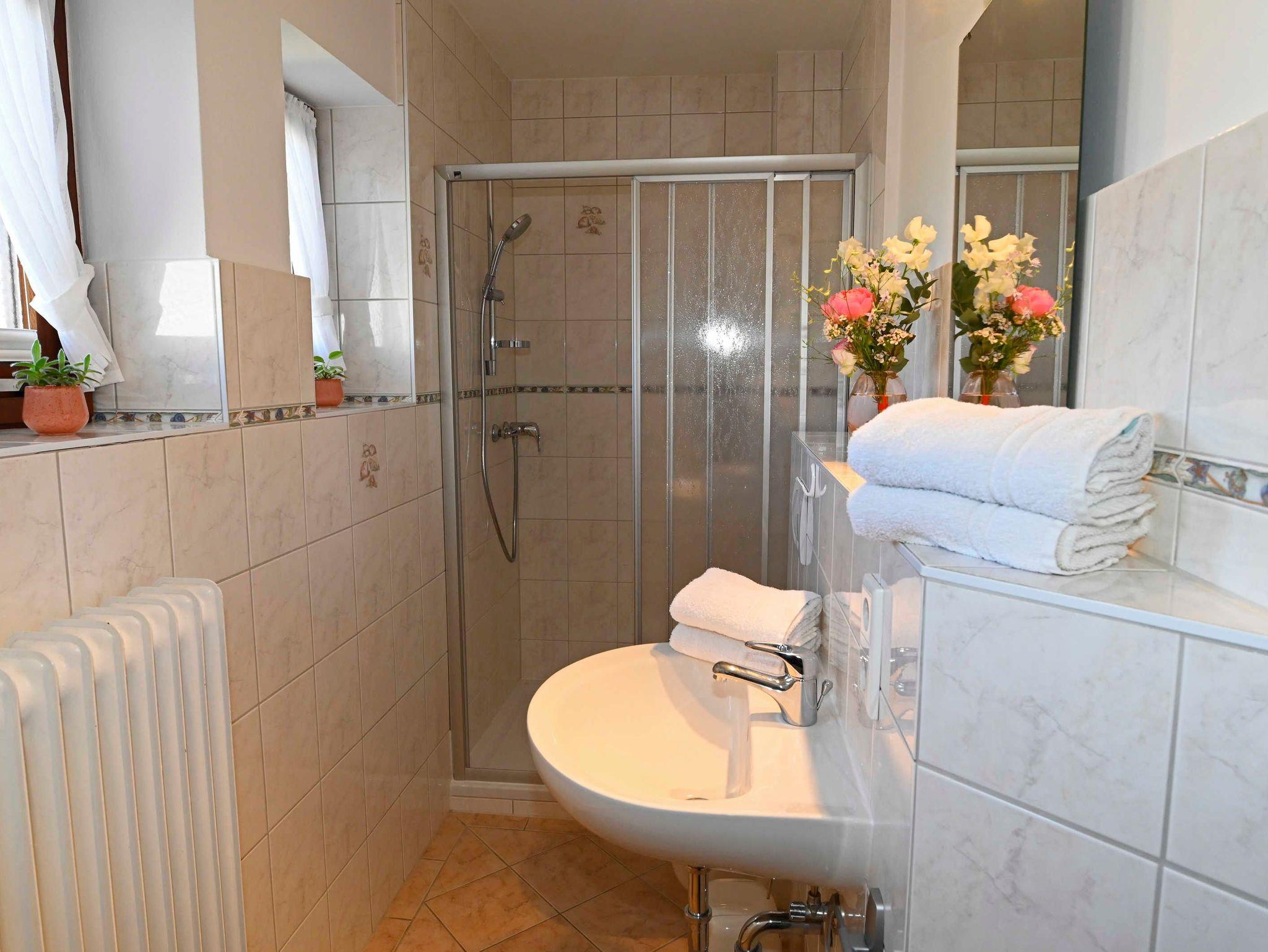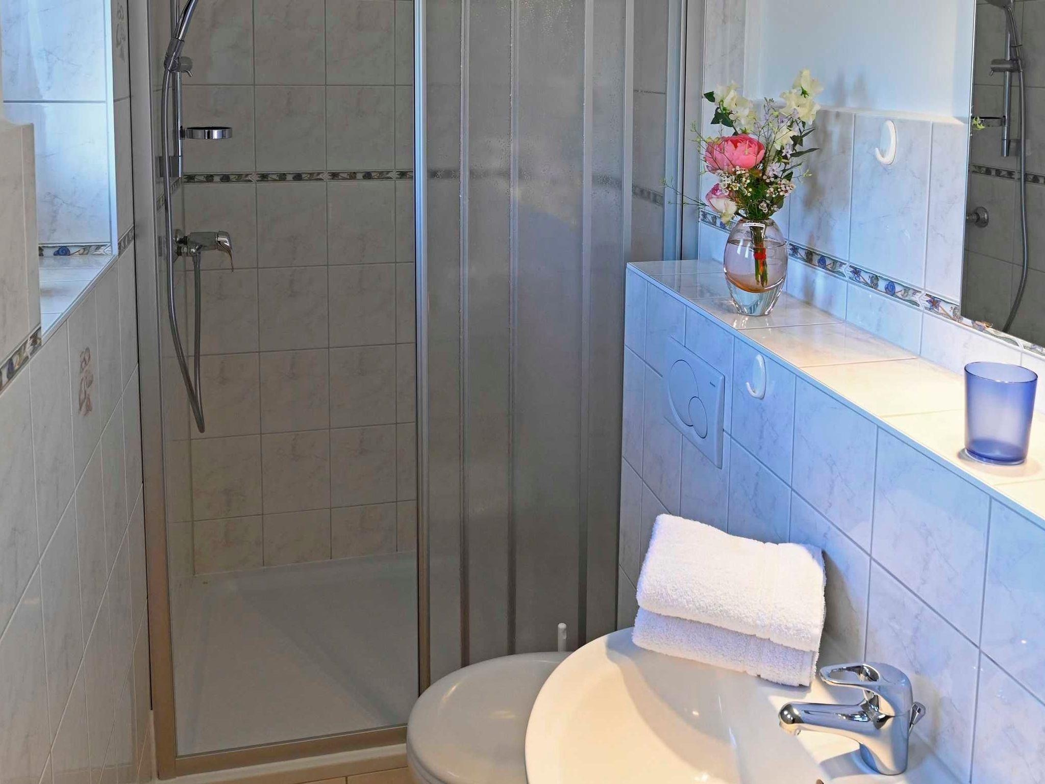 Ein Bad mit Dusche, WC, Waschbecken und Fön.