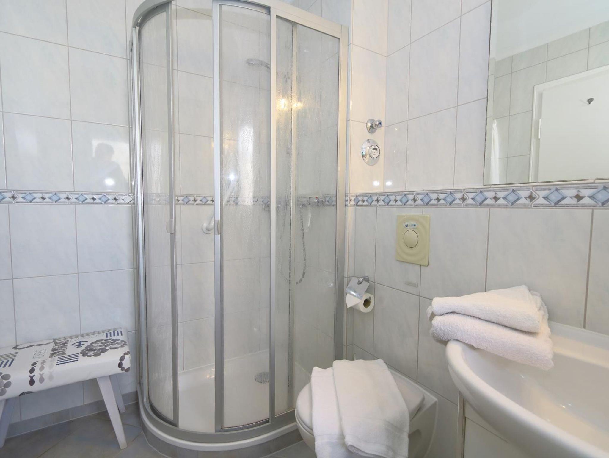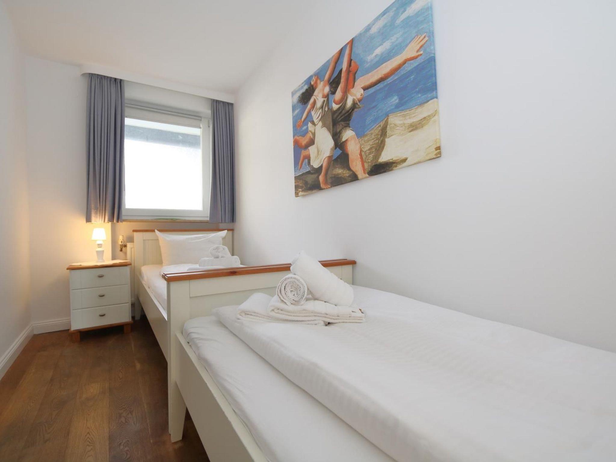 Das Schlafzimmer verfügt über zwei Einzelbetten. Sowohl das Schlafzimmer als auch das Badezimmer mit Fenster sind nach Osten ausgerichtet und profitieren von angenehmem Morgenlicht.