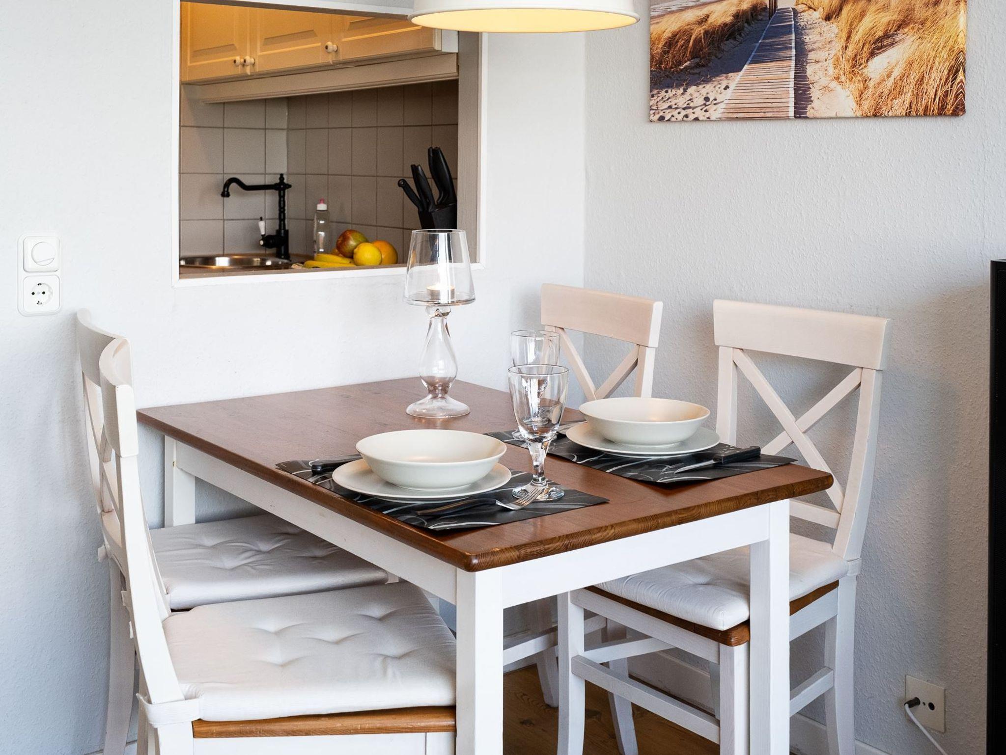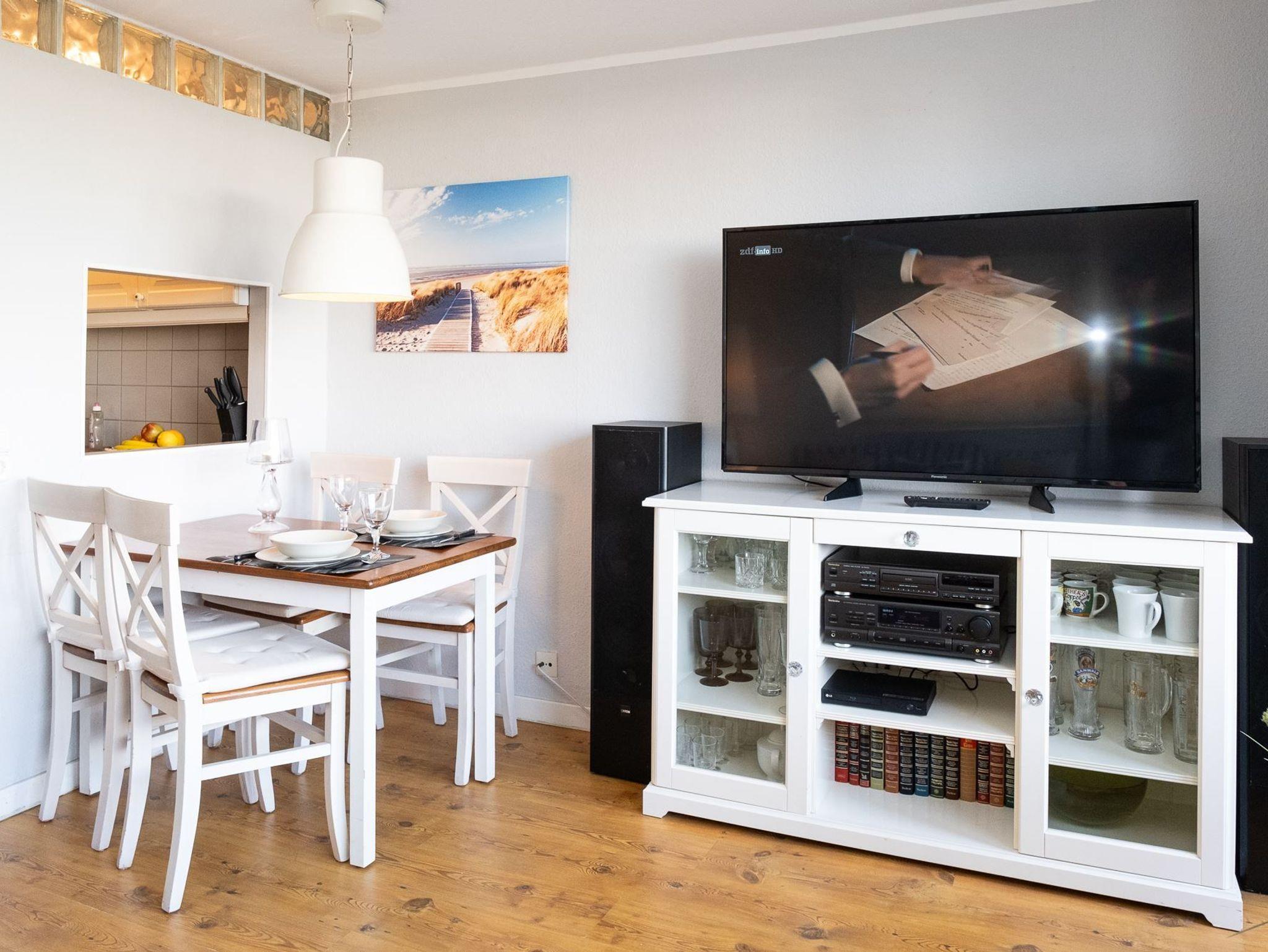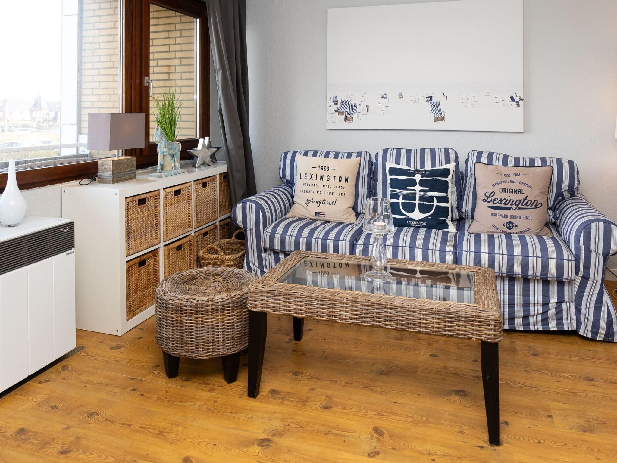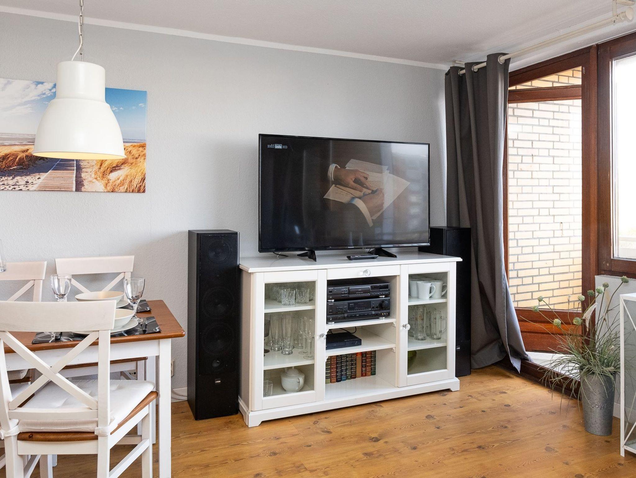 Die Wohnung liegt im 1. Obergeschoss hat einen Laminatboden und ist sehr hell und freundlich eingerichtet. Das aufgrund seiner großen Fensterfront lichtdurchflutete Wohnzimmer besticht durch seine maritime Einrichtung und enthält einen Esstisch für 4 Personen. Im Wohnzimmer ist ein Flachbildfernseher, DVD-Player, Radio und CD-Player vorhanden. Vom Wohnraum gelangen Sie auf den großzügigen nördlich ausgerichteten Balkon mit Blick auf den Brandenburger Platz und den Dünen. Die separate Küche besitzt einen Herd mit 4 Kochplatten, eine Mikrowelle, eine Kaffeemaschine, Toaster und Wasserkocher. Des Weiteren verfügt die Wohnung über einen Schlafraum mit Doppelbett für angenehme Träume und einem Badezimmer mit Duschkabine.