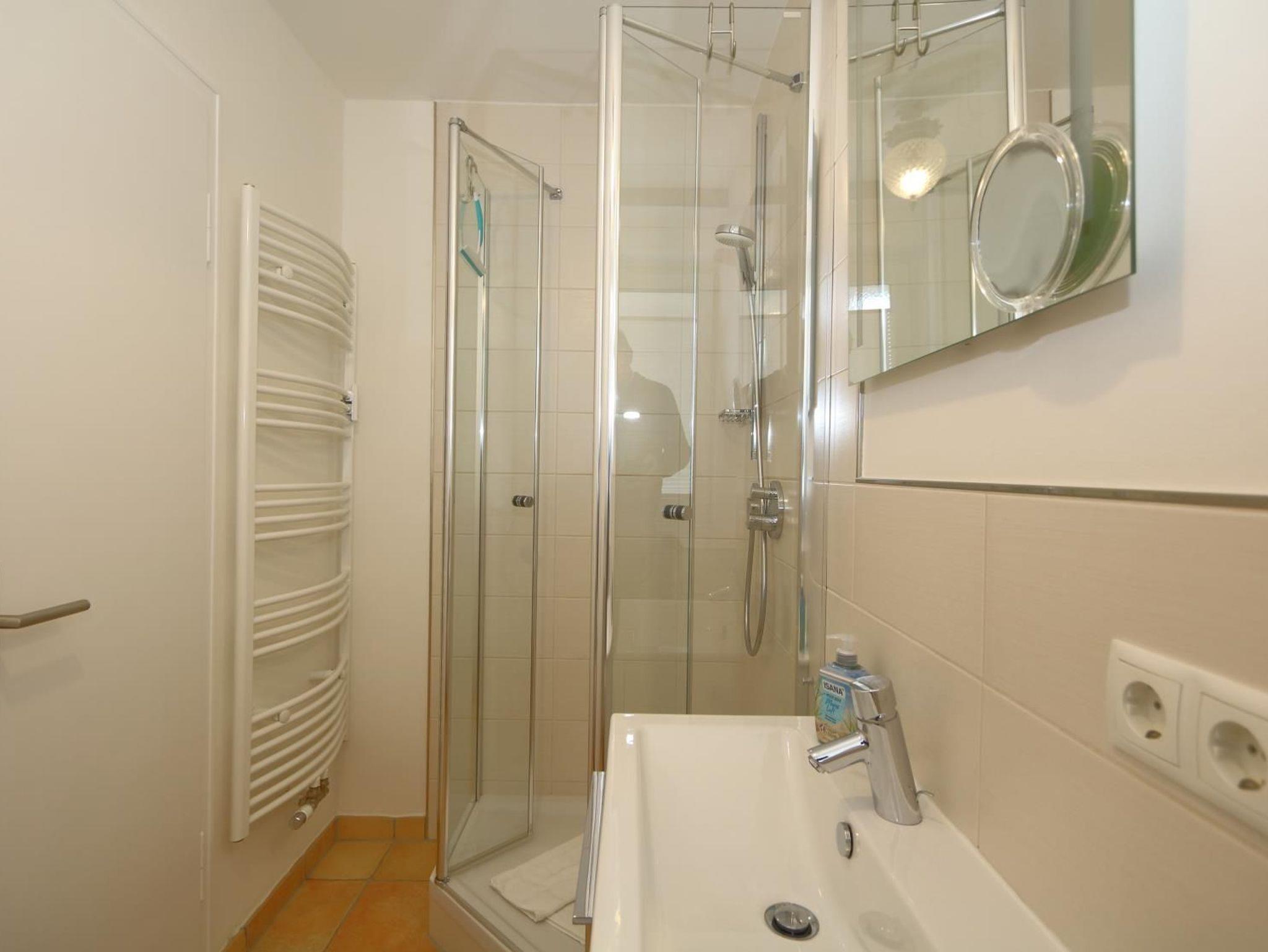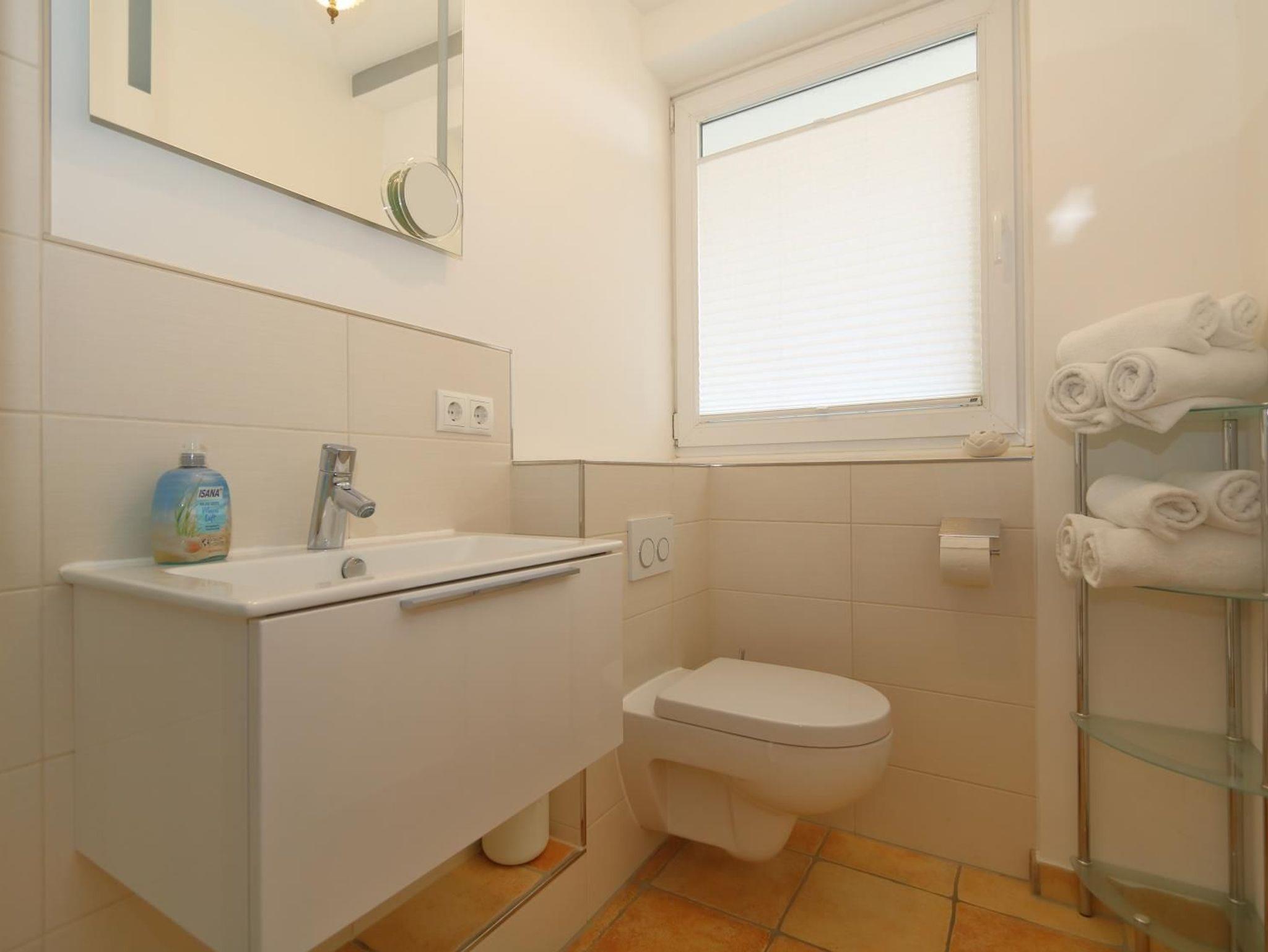 Neues Tageslichtbadezimmer mit Dusche, WC, Waschtisch. Ausreichend Handtücher und Vorleger.