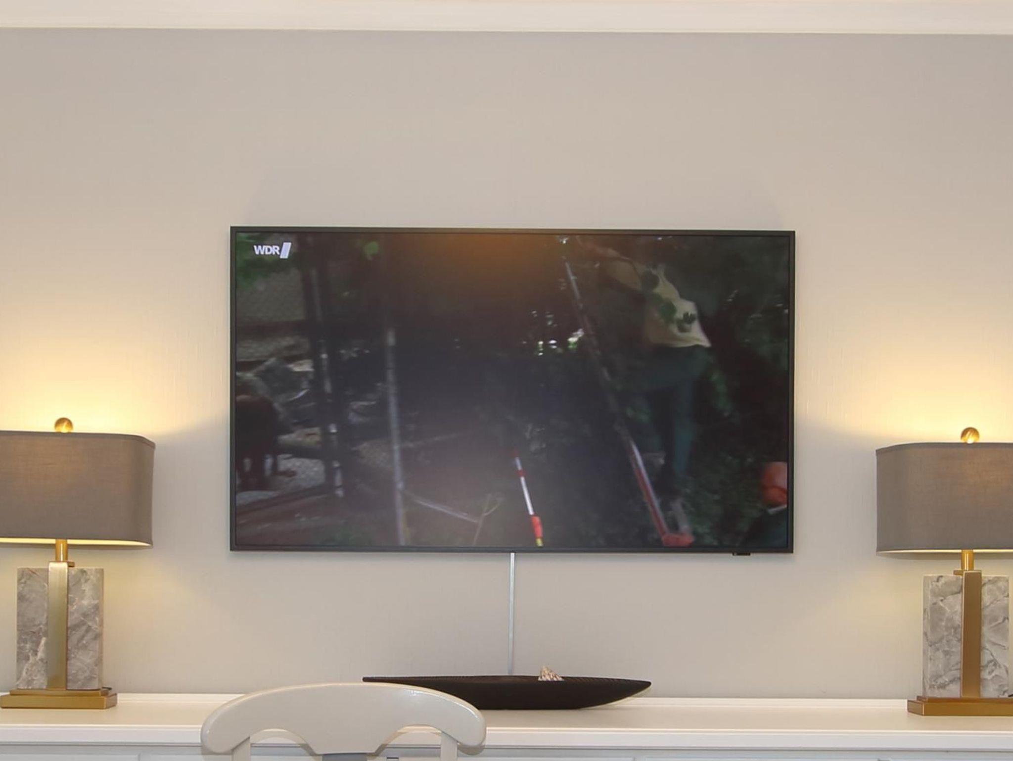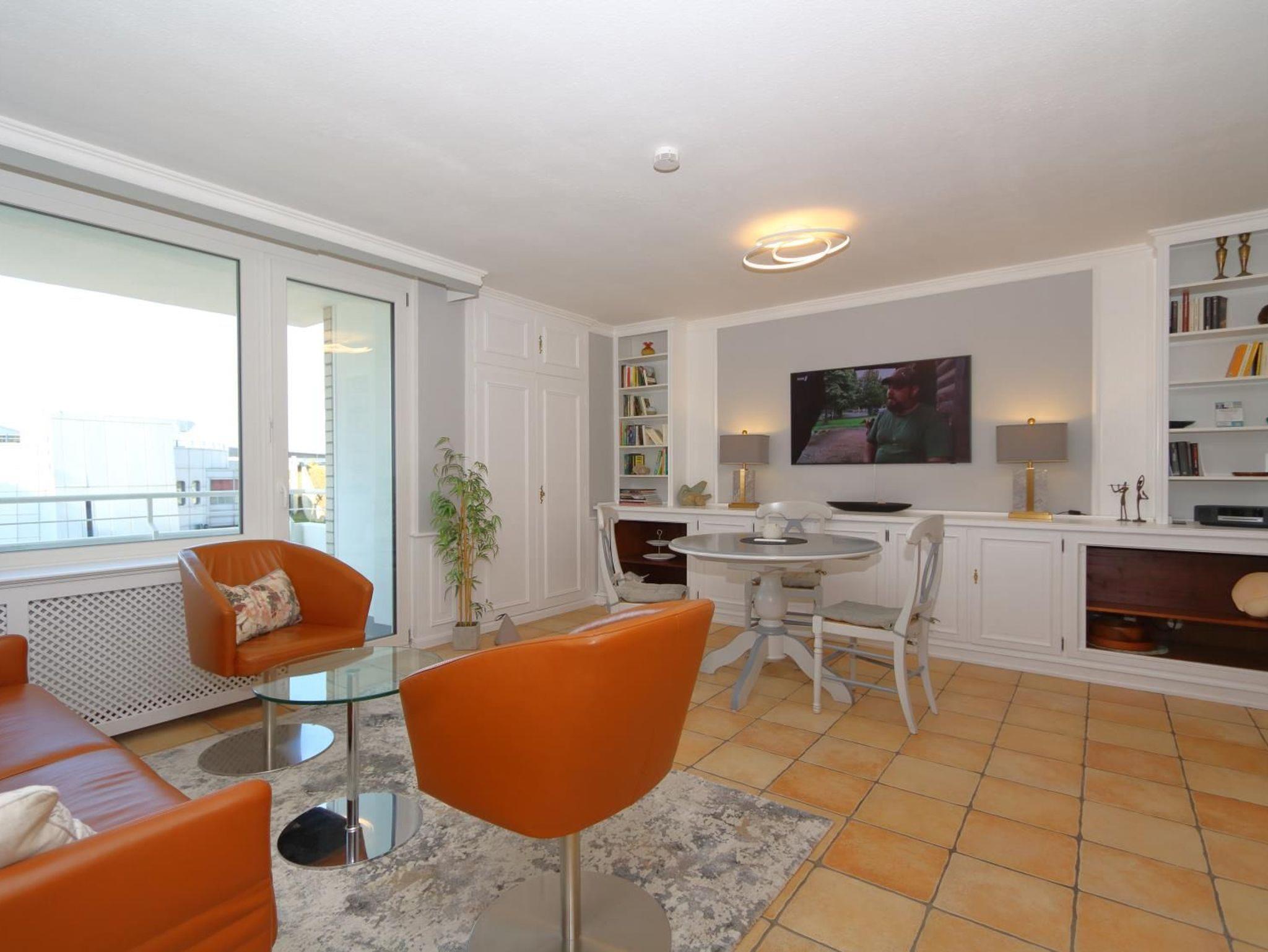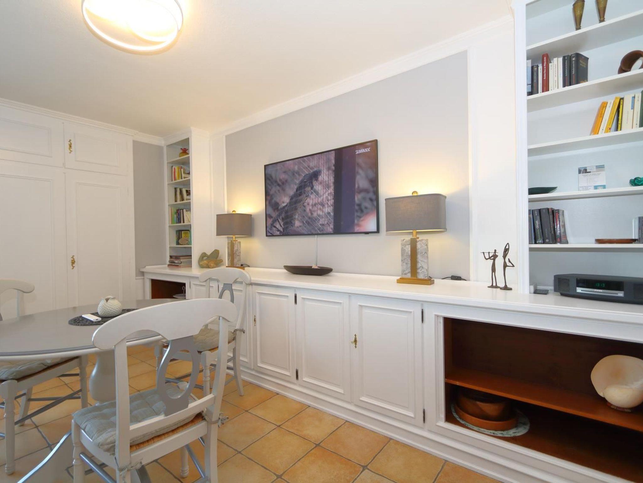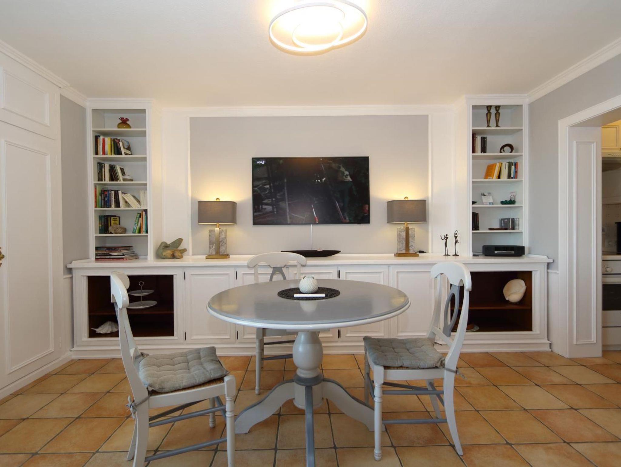 Ein schicker Einrichtungsstiel in modernen Farben erwartet Sie. Moderne Ledersitzgarnitur, großer 55 Zoll Flachbildfernseher und Radio sowie Eßtisch.