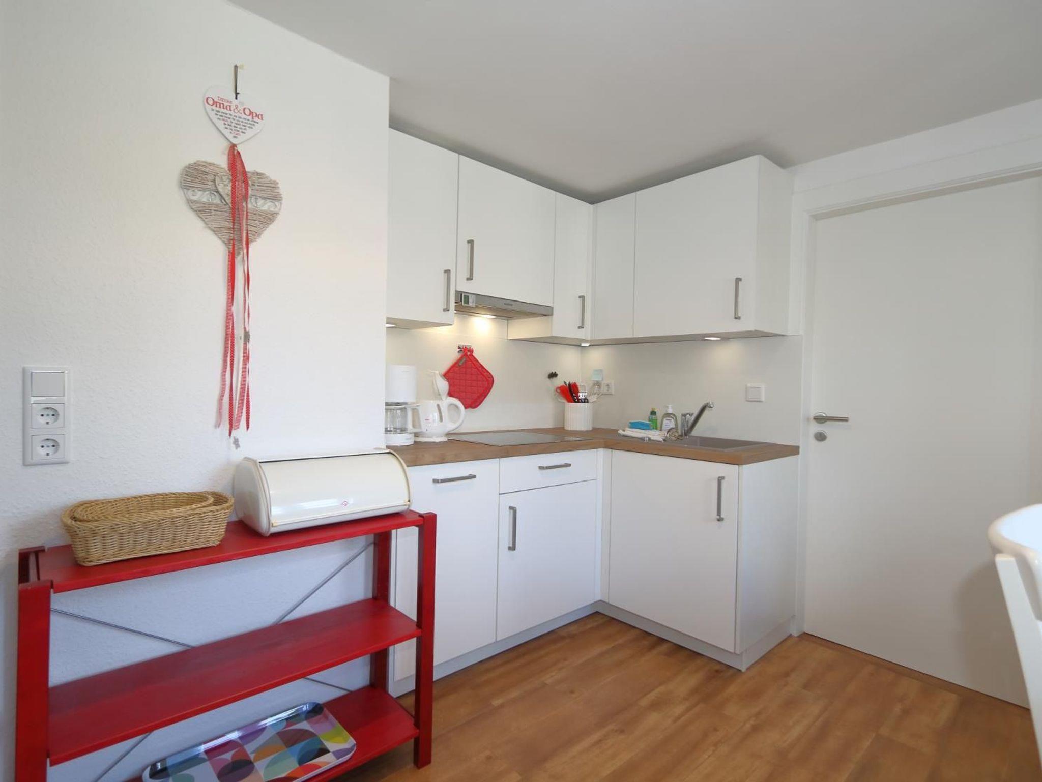 Ausstattung: Das Wohnzimmer ist mit Kabel-TV, Video, Stereo und Internetzugang ausgestattet. In der wohnlich eingerichteten Küche (Mikrowelle und Spülmaschine) ist auch der Essplatz untergebracht. Das innenliegende Schlafzimmer erhält Licht und Luft durch eine zu öffnende Lichtkuppel.Es hat ein Doppelbett und einen zusätzlichen Fernseher inkl. DVD. Das Schlafzimmer ist durch eine breite Glastür vom Wohnzimmer getrennt. Das neue Bad hat Dusche, WC und einen zusätzlichen Heizstrahler. Der vor dem Haus liegende Einstellplatz ist für den Eigentümer reserviert. Wenn dieser nicht anwesend ist, gehört er zum Appartement 2.