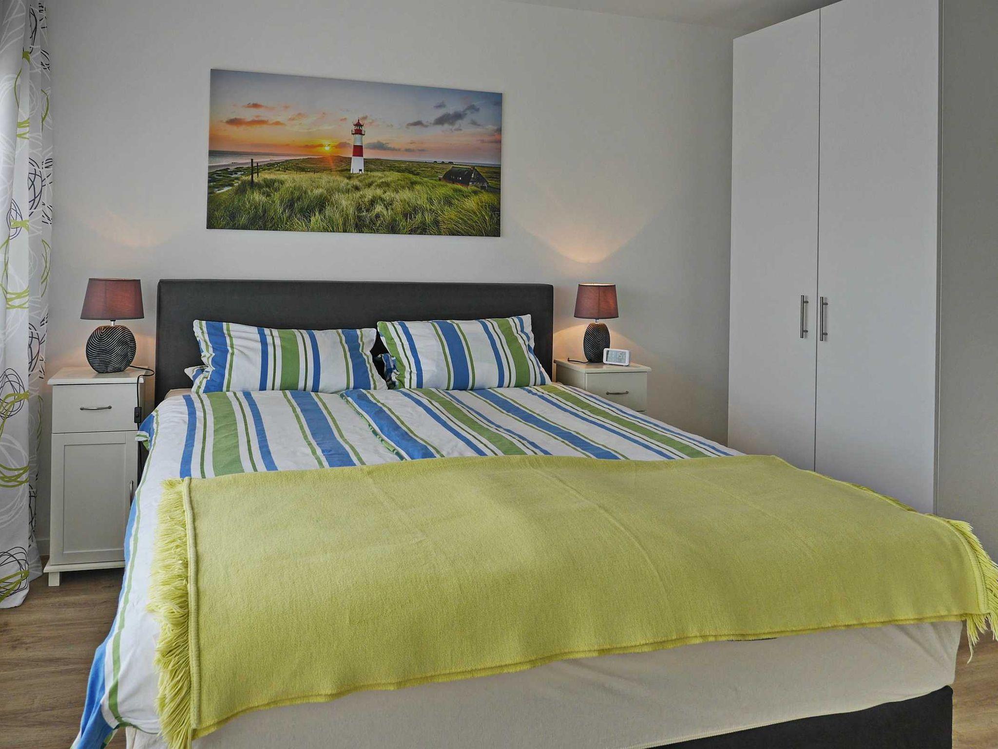 Das Schlafzimmer ist ausgestattet mit einem Doppelboxspringbett, Nachttischen, Leselampen und Kleiderschrank. Bettwäsche und Handtücher sind für Sie zu buchbar.