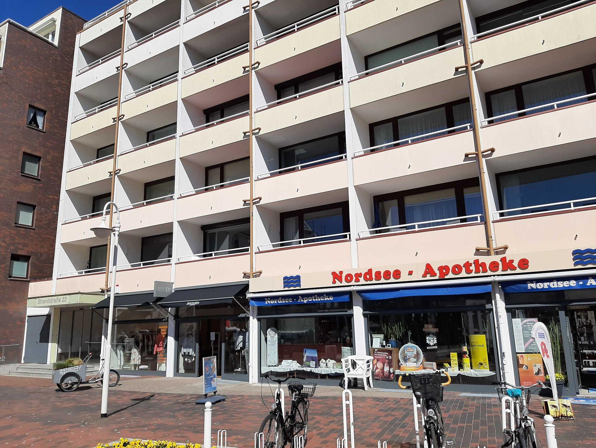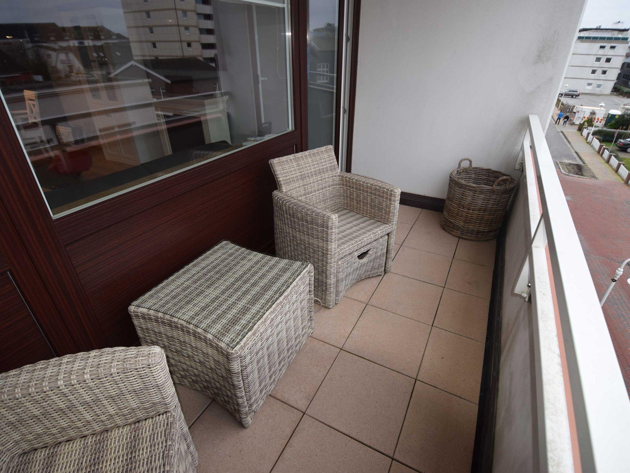 Die Wohnung hat 2 Balkone, die jeweils aus dem Wohn- und dem Schlafzimmer erreichbar sind, mit Ausrichtung Ost/Süd-Ost. Der Haupteingang ist zur Strandstraße gerichtet, der Nebeneingang von der Bomhoffstraße zu erreichen.