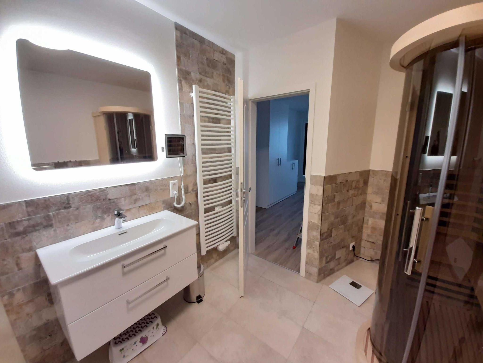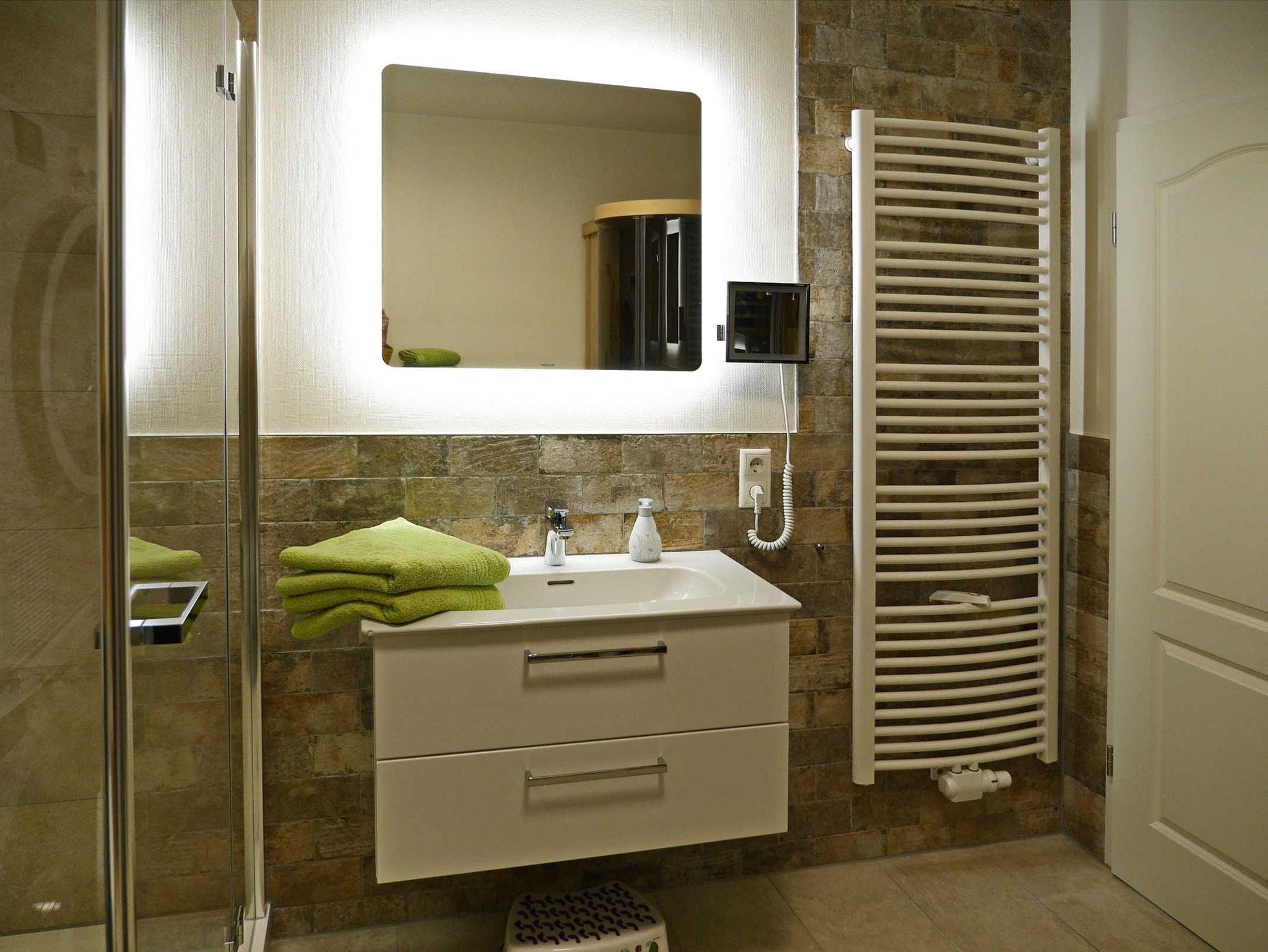 Ein freundliches, modernes, hellgefliestes Bad mit Dusche mit flachem Duscheinstig, WC, komfortablen Waschtisch, Handtuchwärmer und Haartrockner. Außerdem ist für die kalten Tage im Bad eine Infrarot-Sauna integriert. Waschmaschine und Trockner steht Ihnen in der Ferienwohnung zur Verfügung.