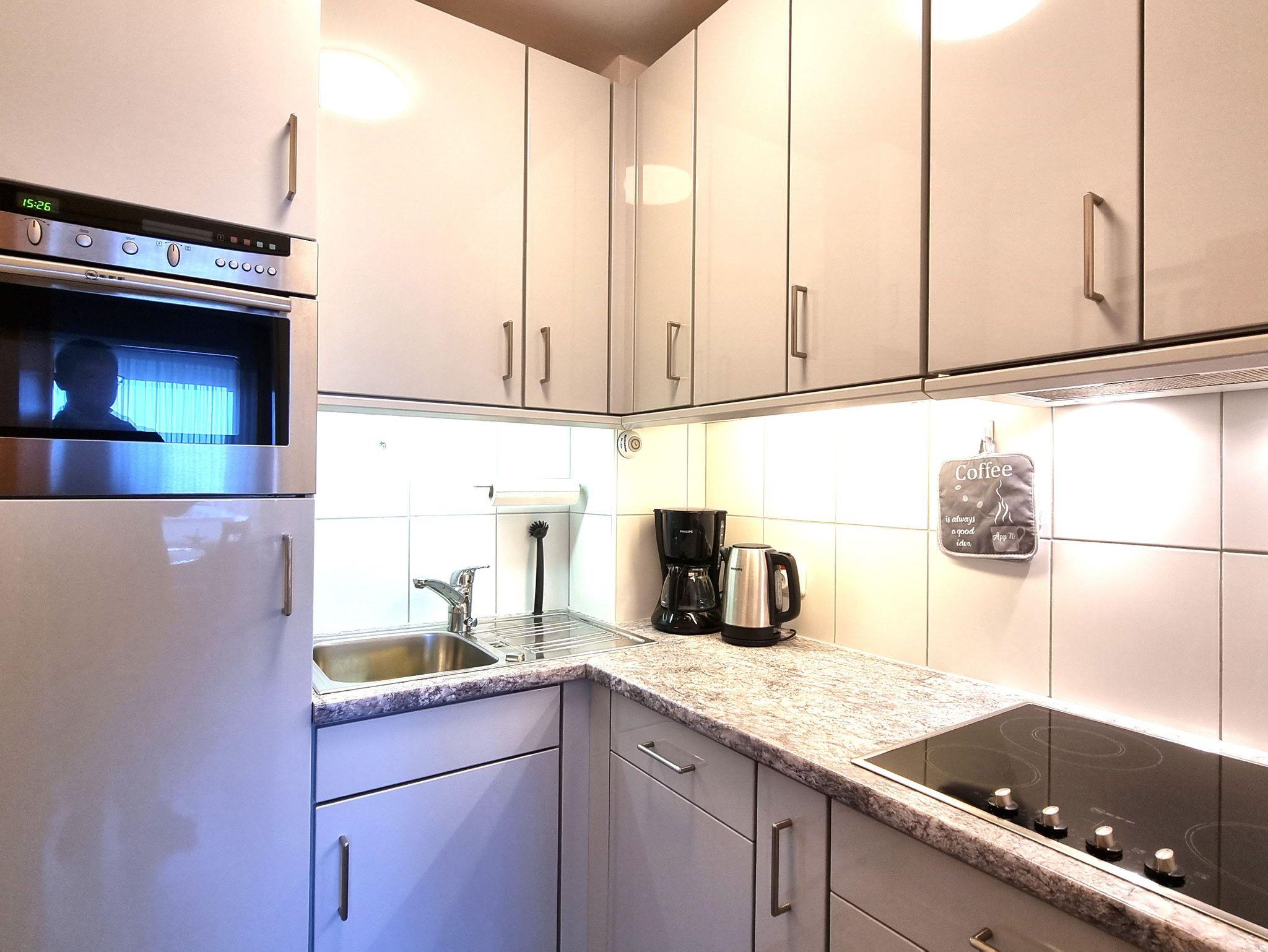• Die Einbauküche verfügt über ein 4-Platten-Glaskeramikkochfeld, Backofen, Mikrowelle, Kühlschrank mit Gefrierfach, Wasserkocher, Kaffeemaschine, Toaster und ausreichend Geschirr.