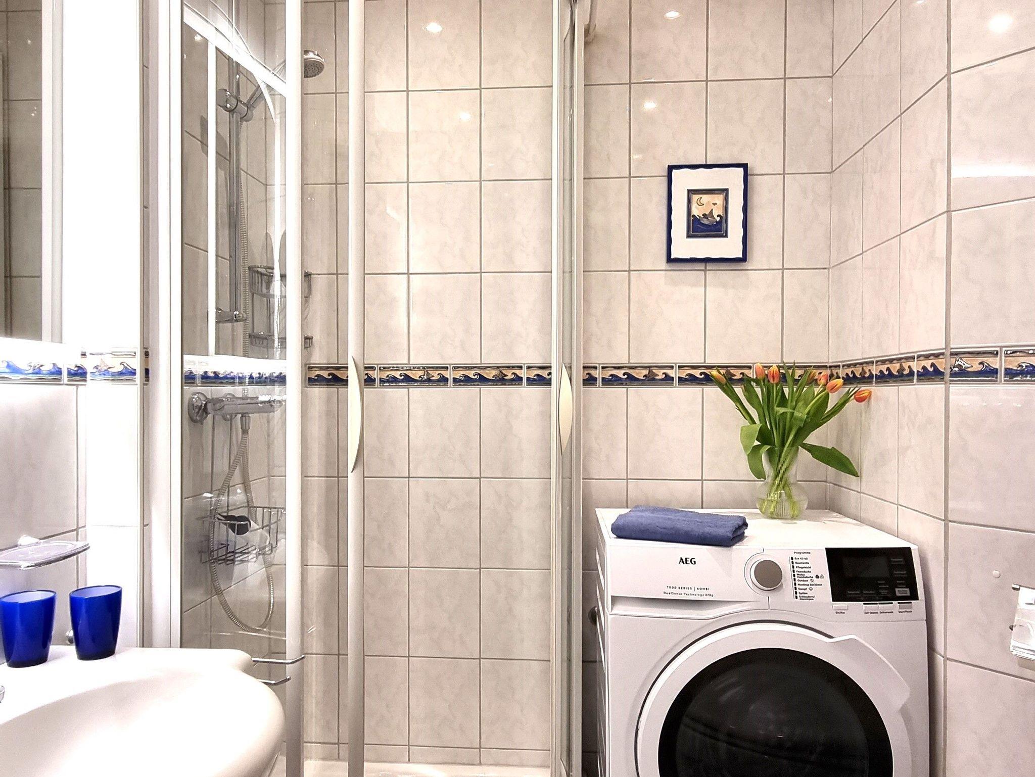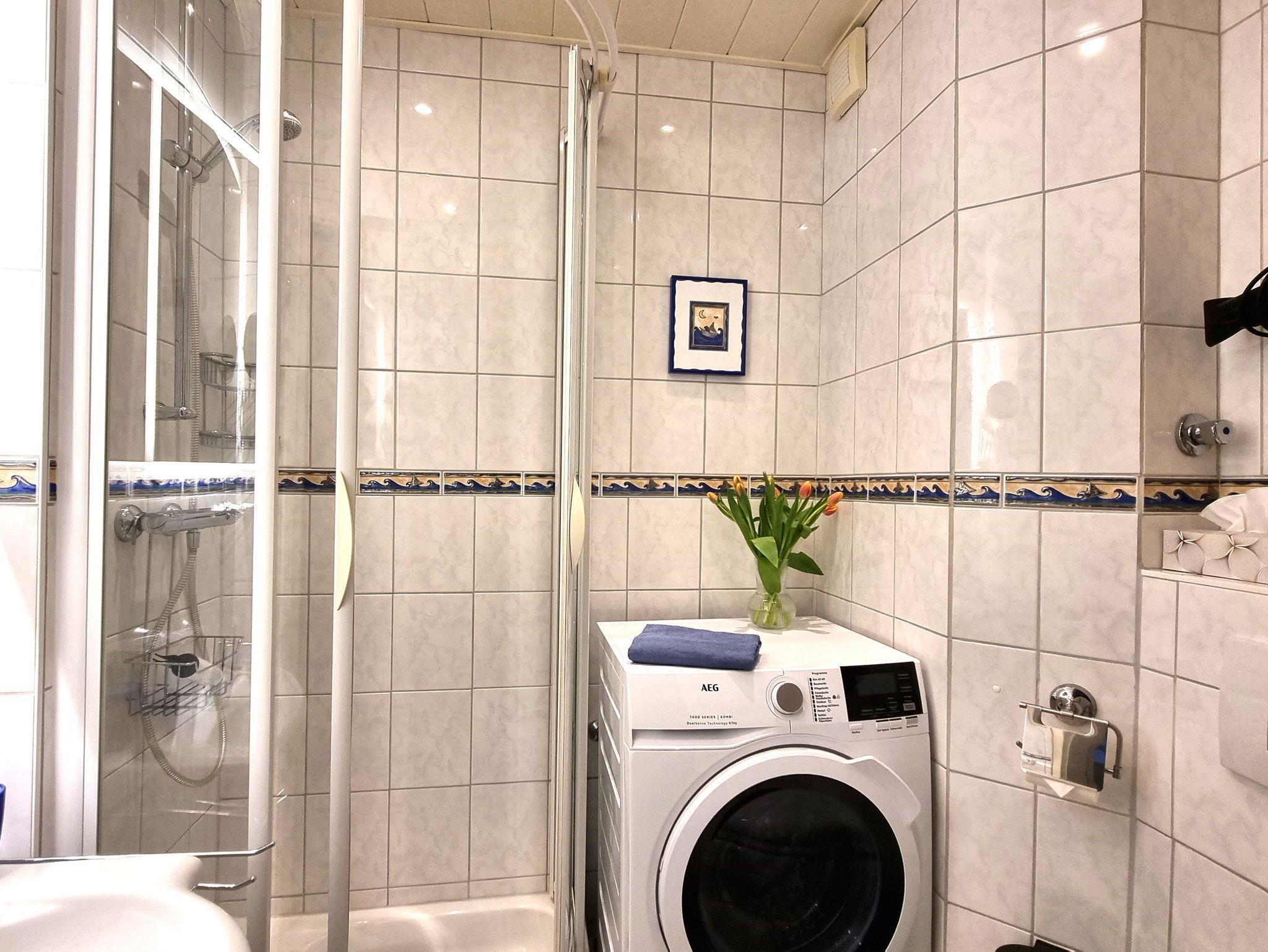 • Bad mit Dusche und WC, Wasch-Trockenautomat, Handtuchtrocknerheizkörper;