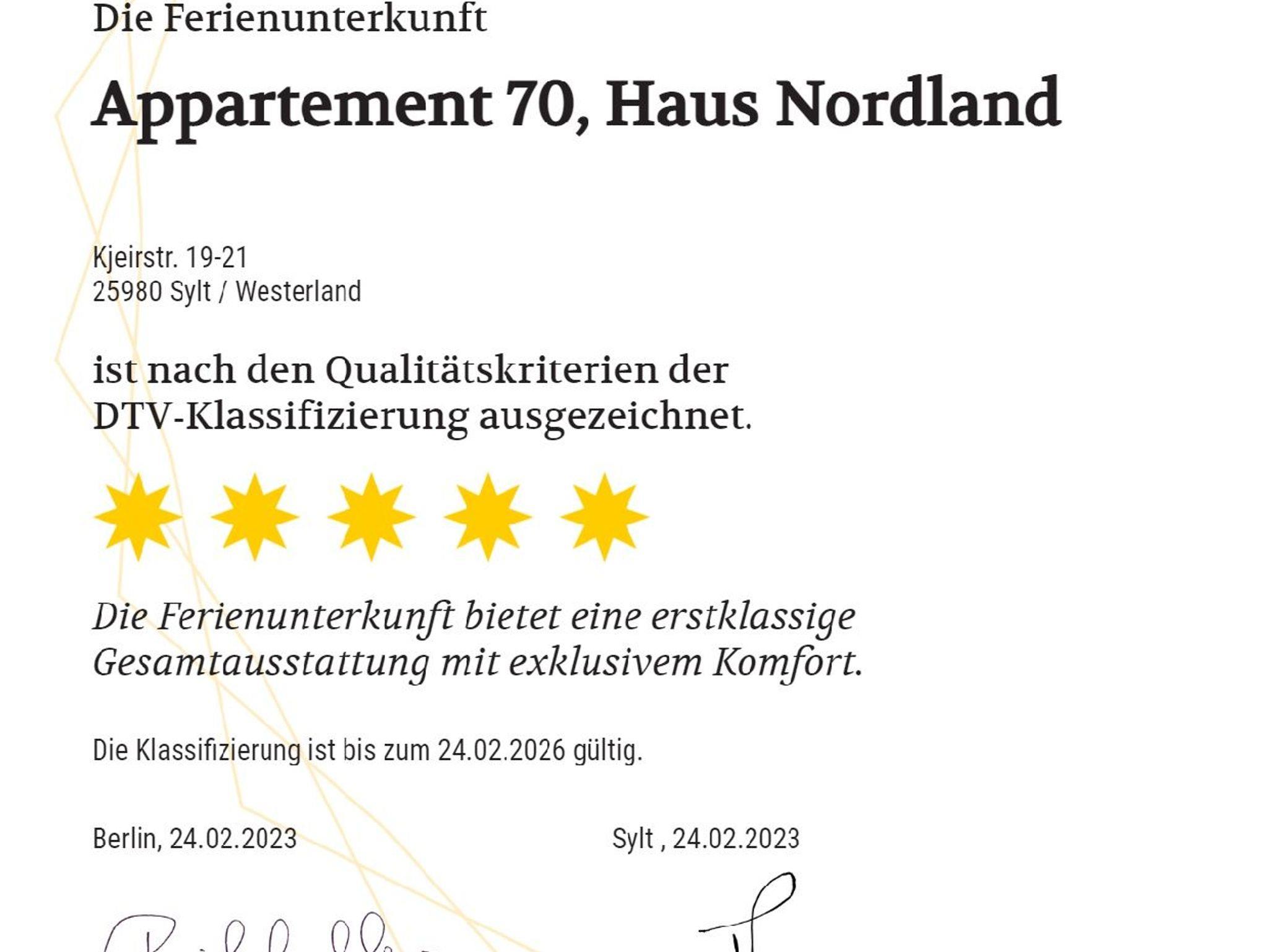 • Diese Wohnung wurde vom DTV (Deutscher Tourismusverband) mit 5-Sternen bei einer Belegung mit 2 Personen klassifiziert. Bei einer Belegung von mehr als 2 Personen ist der DTV-Sterne-Standard von 5-Sternen nicht mehr gewährleistet.