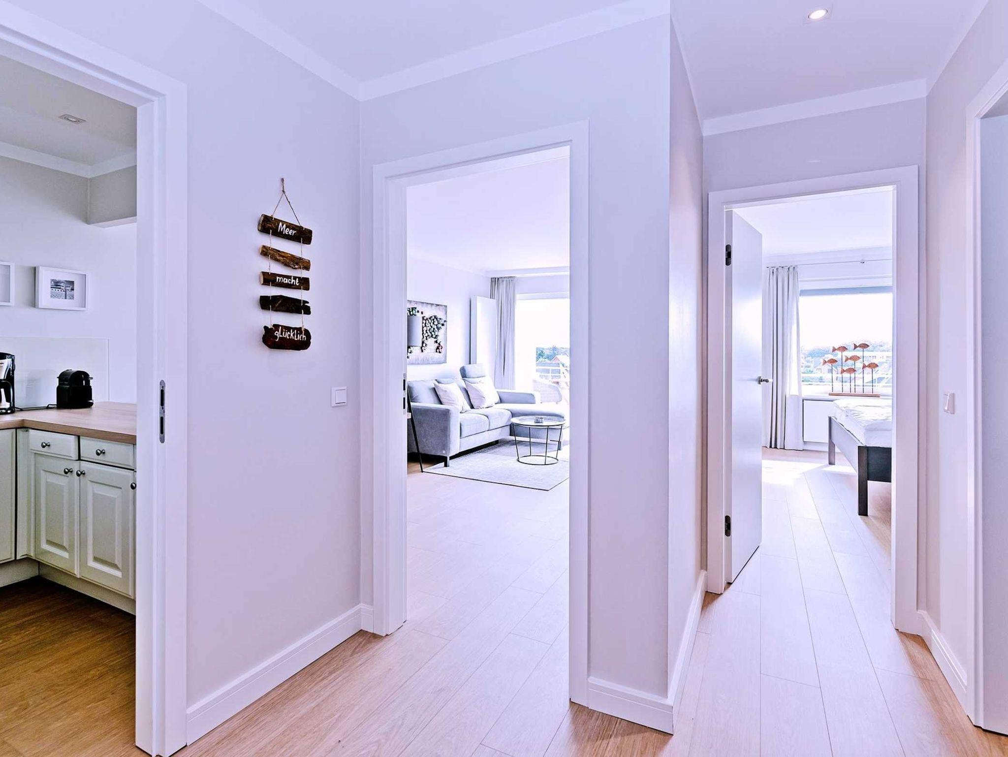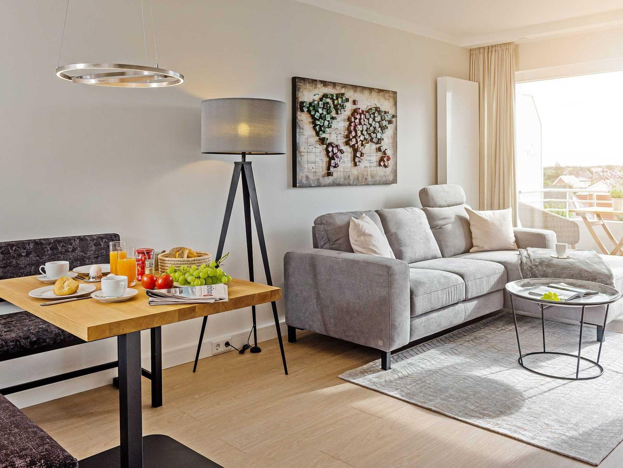 Im obersten Stockwerk eines gepflegten Appartementhauses finden Sie diese bezaubernde, ca. 54 m² große Eckwohnung für 2 Personen. Das helle Domizil unterteilt sich in eine großzügige Diele mit Garderobe, ein schönes Duschbad, eine Abstellkammer mit Waschtrockner, ein freundliches Schlafzimmer mit viel Schrankraum, ein stylisches und sehr gemütliches Wohnzimmer mit separierter, voll ausgestatteter Küche und einen großen, fast 9 m langen Balkon mit bequemen Balkonmöbeln. Ihr Lieblingsplatz !