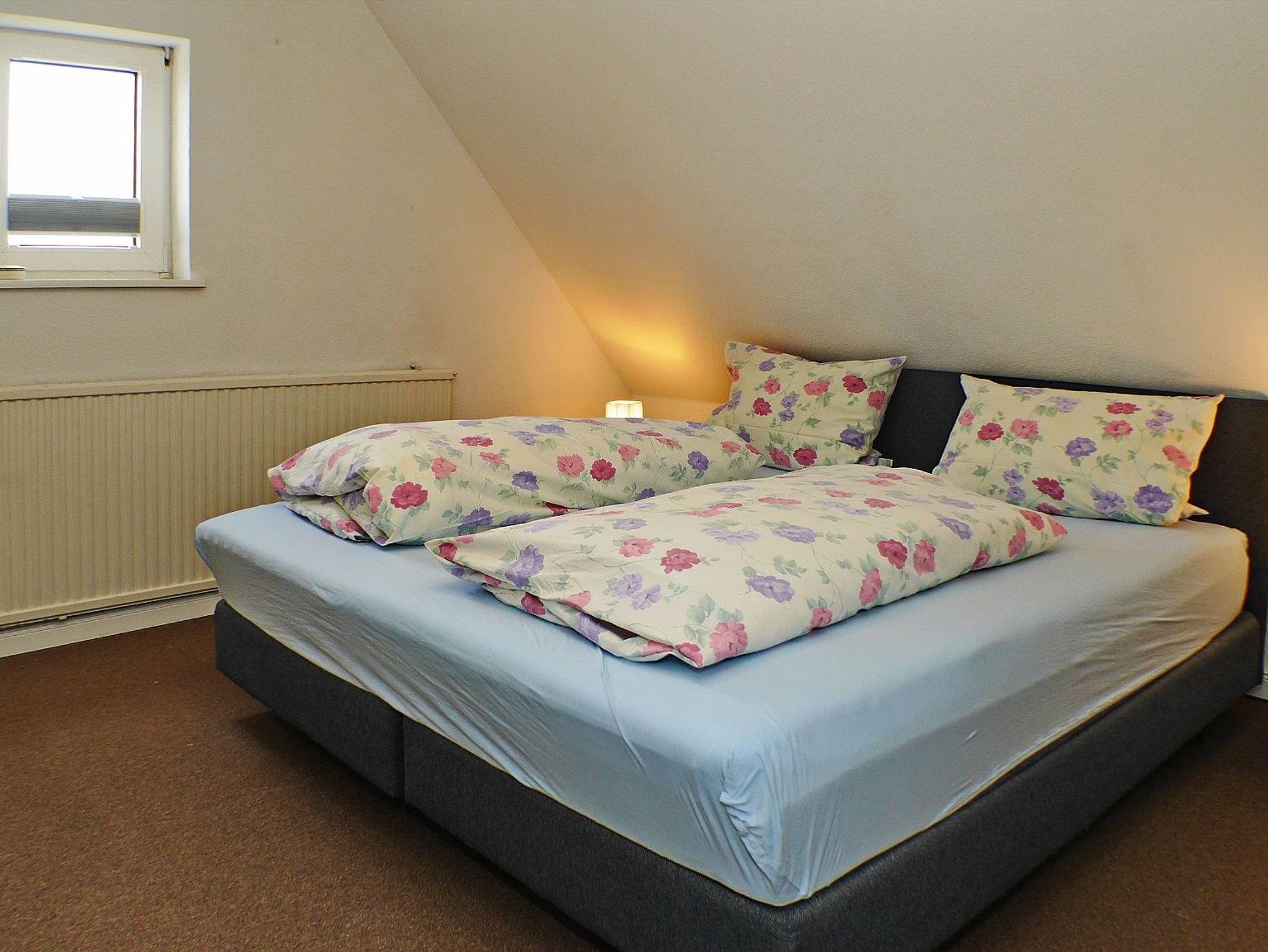 Ein gemütliches Schlafzimmer bietet ein Doppelboxspringbett (180x200) mit offenem Fußende, Nachtisch, Leselampen und einem Einbaukleiderschrank alles, was ein entspannter Sylturlaub benötigt.