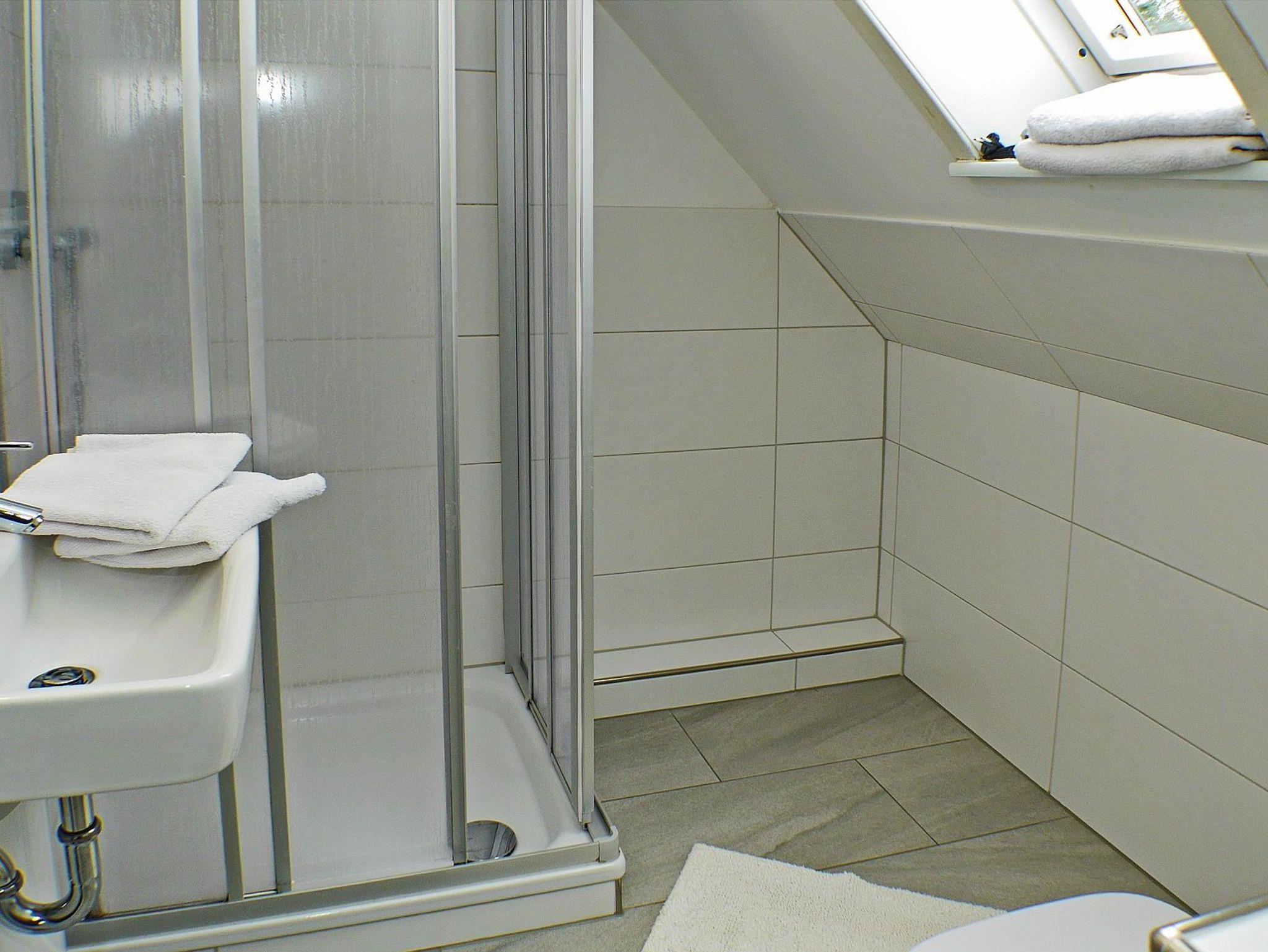 Ein Bad mit Waschbecken, Dusche, WC, Handtuchwärmer, Haartrockner und Außenfenster