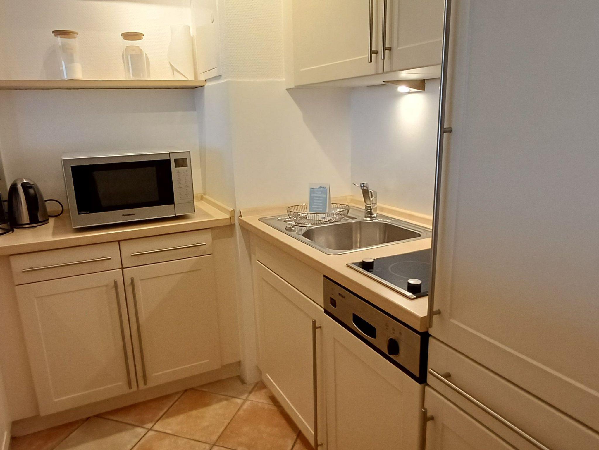Die offene Küche mit Ceranfeld, Mikrowelle (inkl. Umluft-Backofen-Funktion und Grill), Kaffeemaschine, Spülmaschine, Wasserkocher, Kühlschrank mit