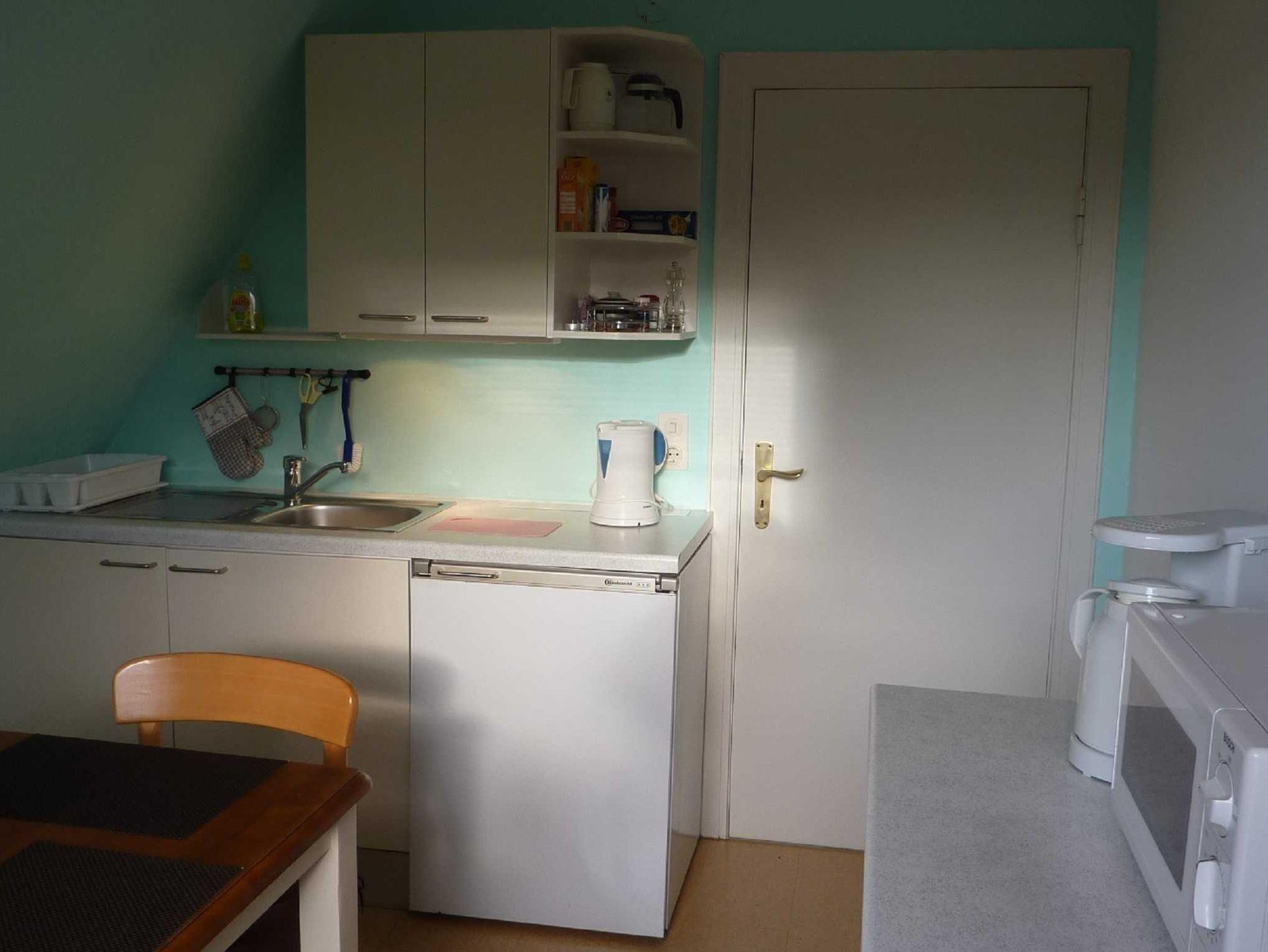 Die separate Küche ist ausgestattet mit einem Essbereich, 2-Plattenkochfeld, Mikrowelle, Kühlschrank mit Gefriermöglichkeit, Kaffeemaschine, Wasserkocher, Toaster auf Anfrage und Geschirr für den täglichen Gebrauch.