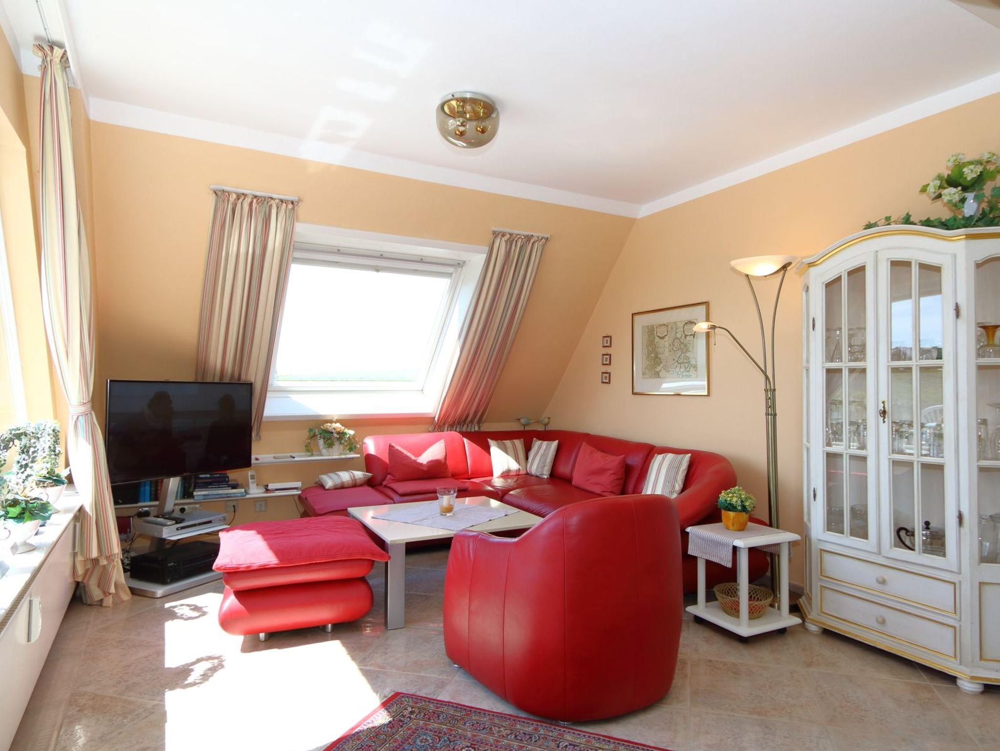 Ein helles Wohnzimmer mit großer Fensterfront zum möblierten Balkon und Dünen mit Sitzecke und Strandkorb. Großer Smart-Tv mit Sat-Anschluß, Eßecke und Couchgarnitur, W'Lan, DVD-Player und Telefon mit Flatrate für das deutsche Festnetz.