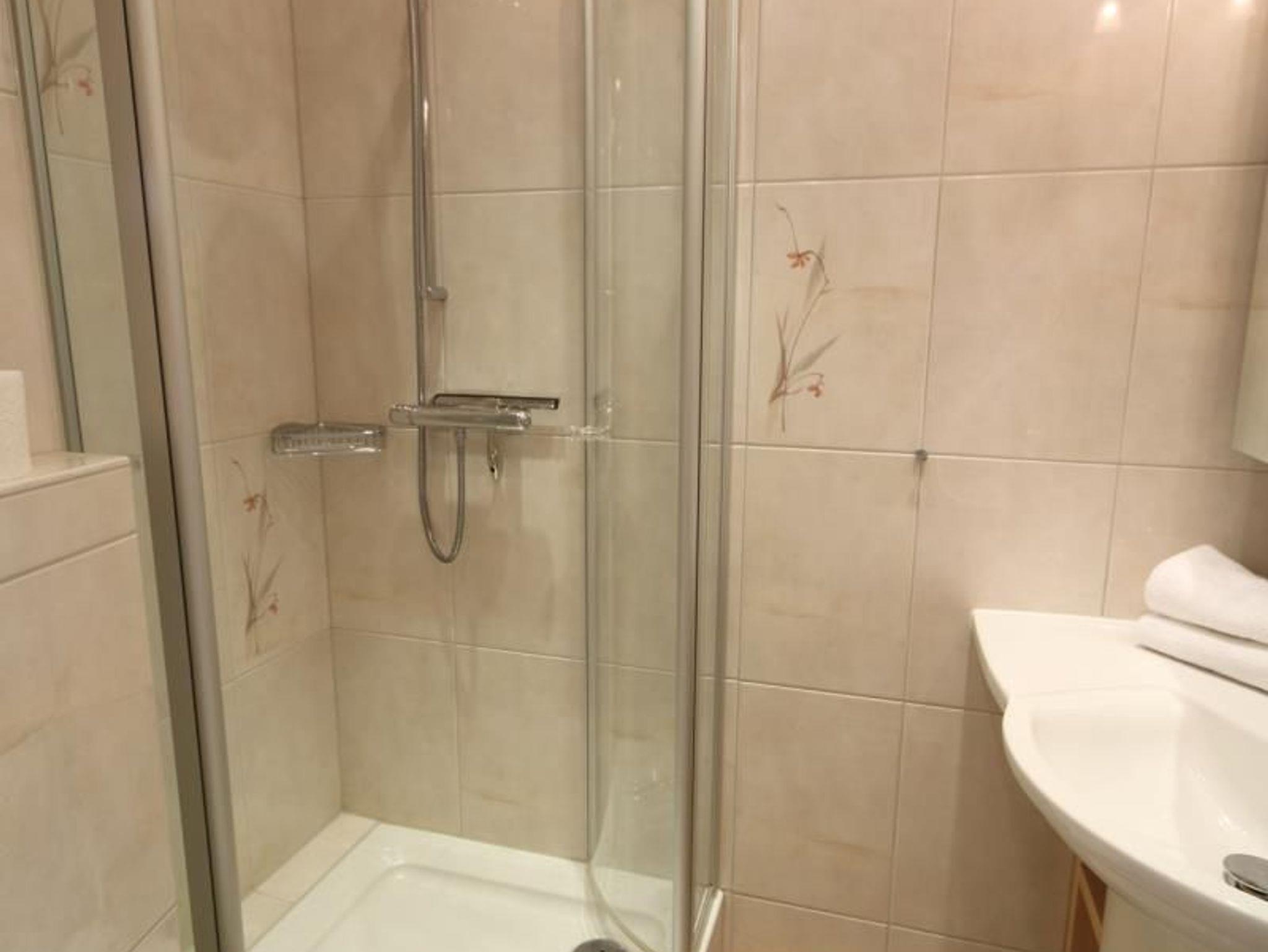 Badezimmer mit Dusche, WC, Waschtisch. Ausreichend Handtücher und Vorleger.