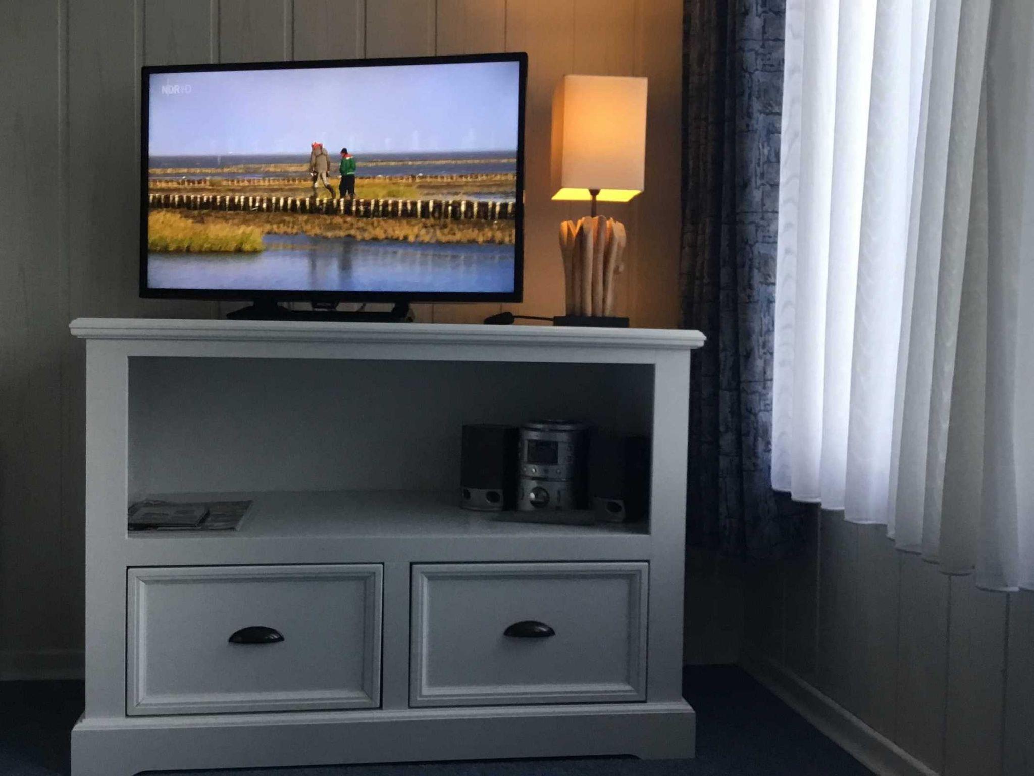 Ein Wohn/ Schlafraum mit einem Sessel, Couchtisch, Flachbild-TV, Stereoanlage, geräumiger Spiegelschrank und einem gemütlichen Einzelbett (90x200cm) ist der Mittelpunkt der Wohnung.