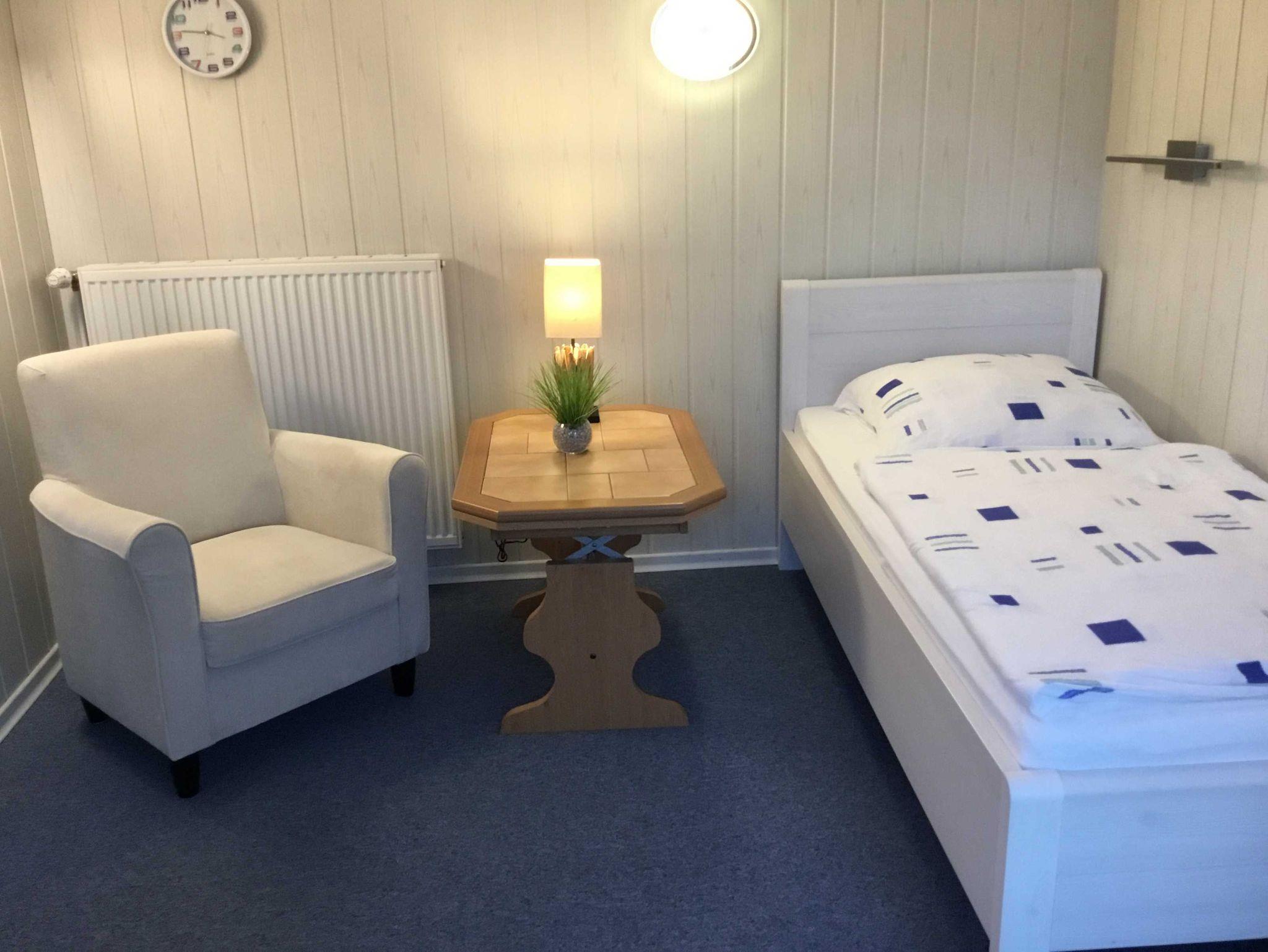 Die 1-Zimmer - Single Wohnung „Peter“ (ca.18m²) für eine Person liegt ebenerdig in einem Bungalowanbau im Garten.
