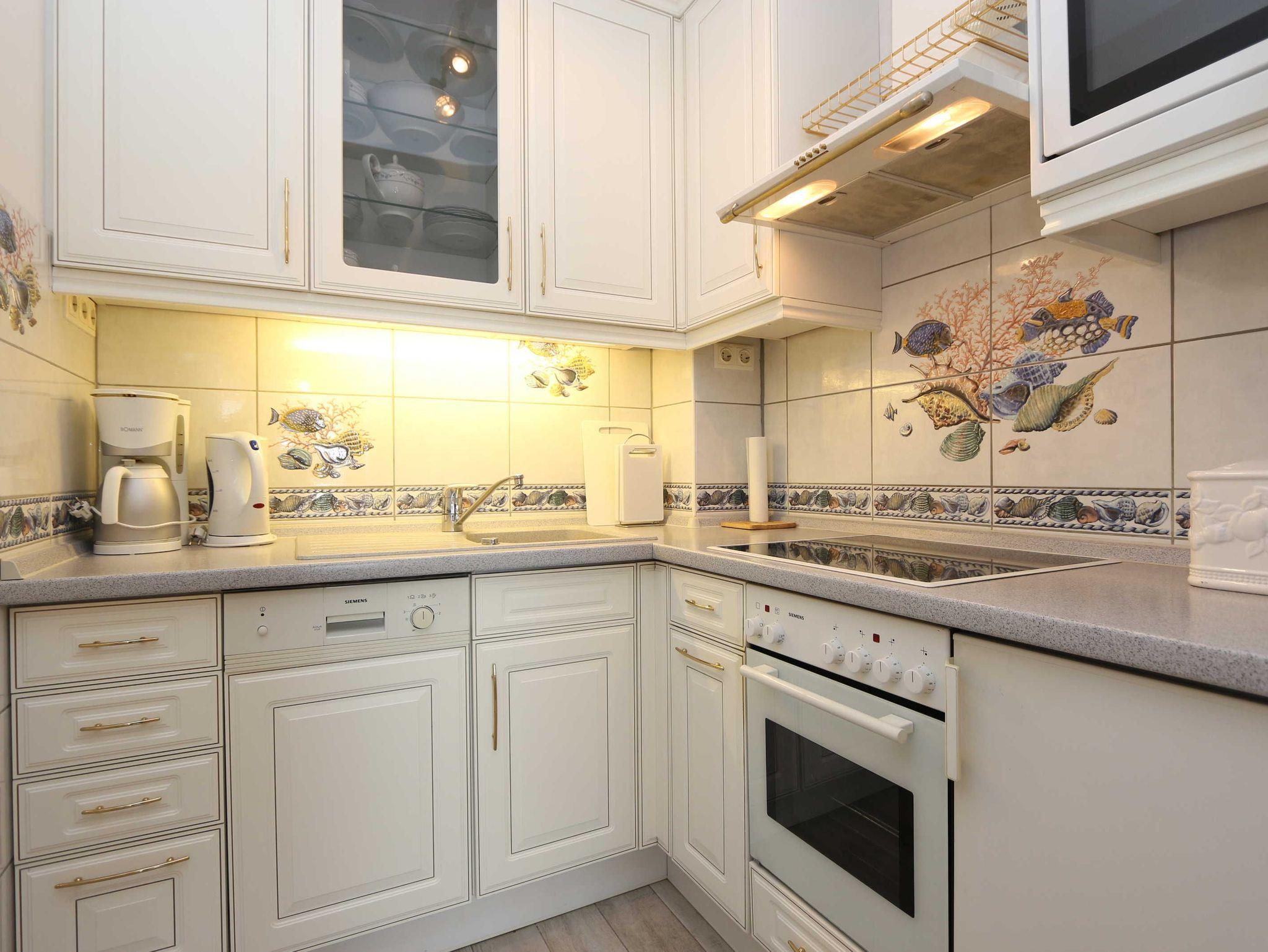 • schöne Einbauküche mit Glaskeramikkochfeld, Backofen mit Grill, Mikrowelle, Kühlschrank mit Gefrierfach, Geschirrspüler, Kaffeemaschine, Toaster, Wasserkocher, Eierkocher, Elektromixer;