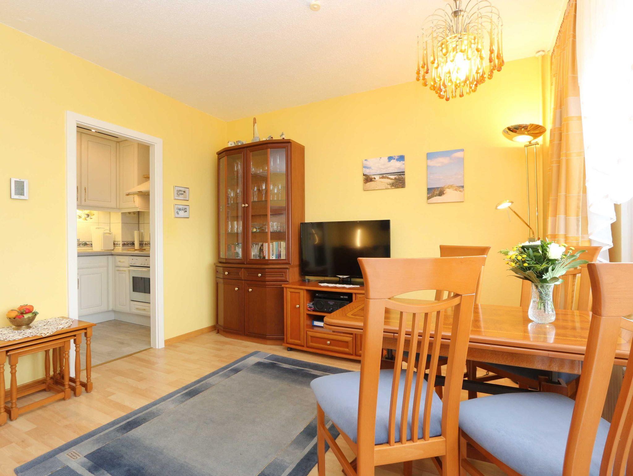 • Das Wohnzimmer ist mit Kabel-TV, Sofa und Sessel, Esstisch mit 4 Stühlen, Wohnzimmerschrank und Flachbildfernseher und DVD ausgestattet.