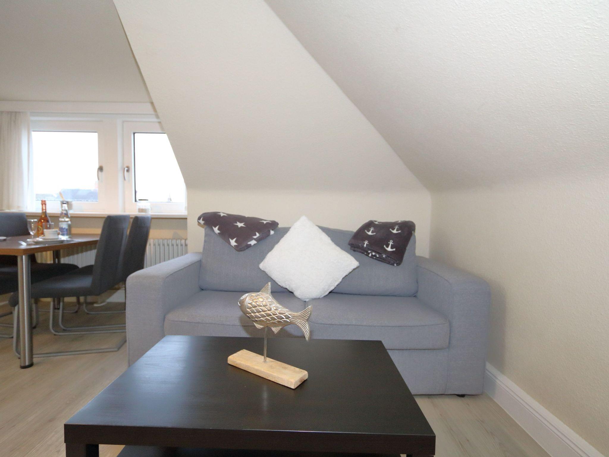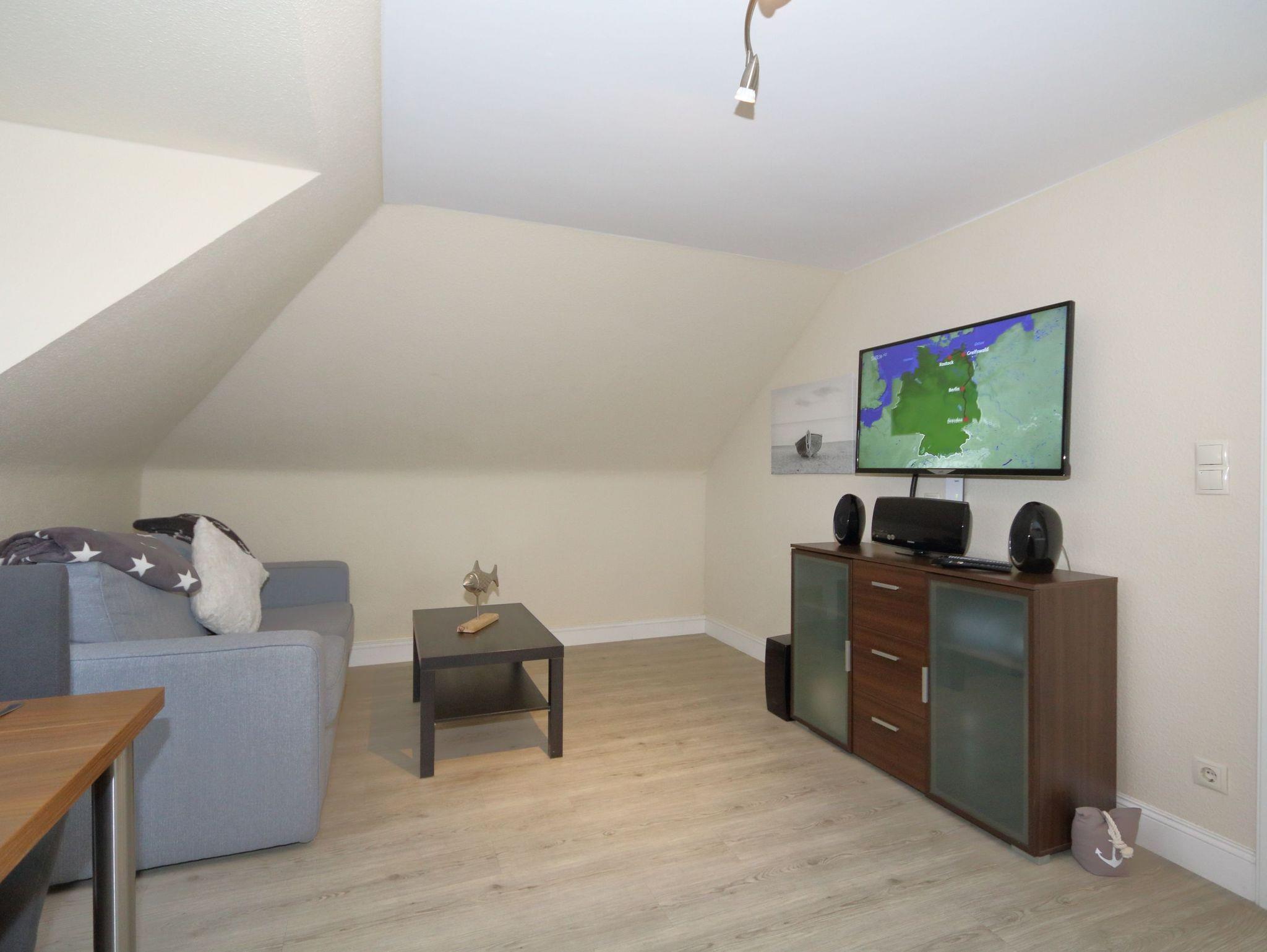 Im Wohnzimmer ist eine bequeme Schlaf-Couchgarnitur mit Clubtisch und Sessel. Eine kleine Eßecke für 4 Personen schließt sich daran an.