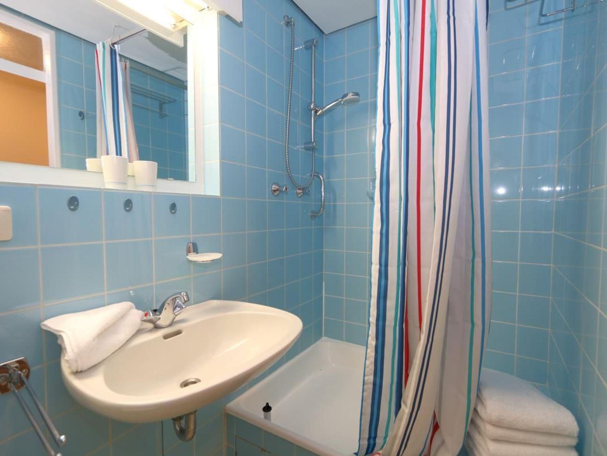 WC, Dusche, Waschbecken, Spiegel und ausreichend Handtücher und Vorleger.