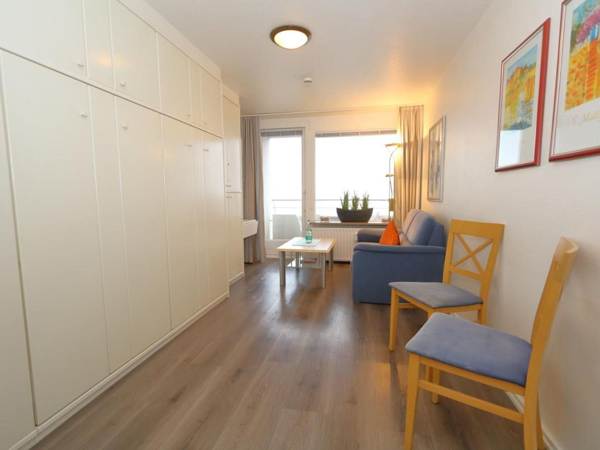 Wohn-/Schlafzimmer mit TV SAT/Kabel, W'Lan, Sofa, Schrankbett, Eßtisch sowie zugang zum Balkon.