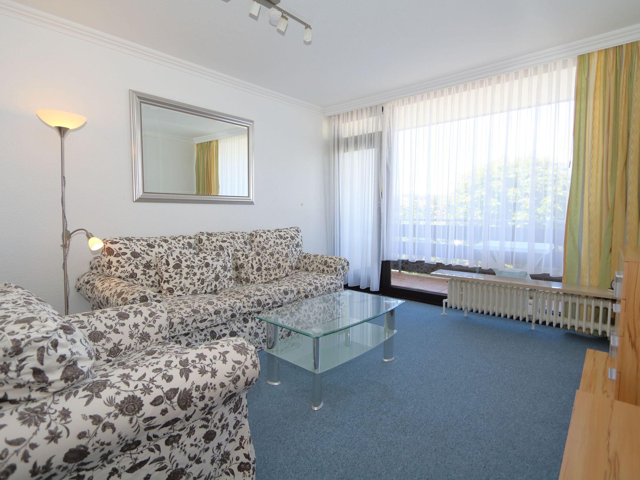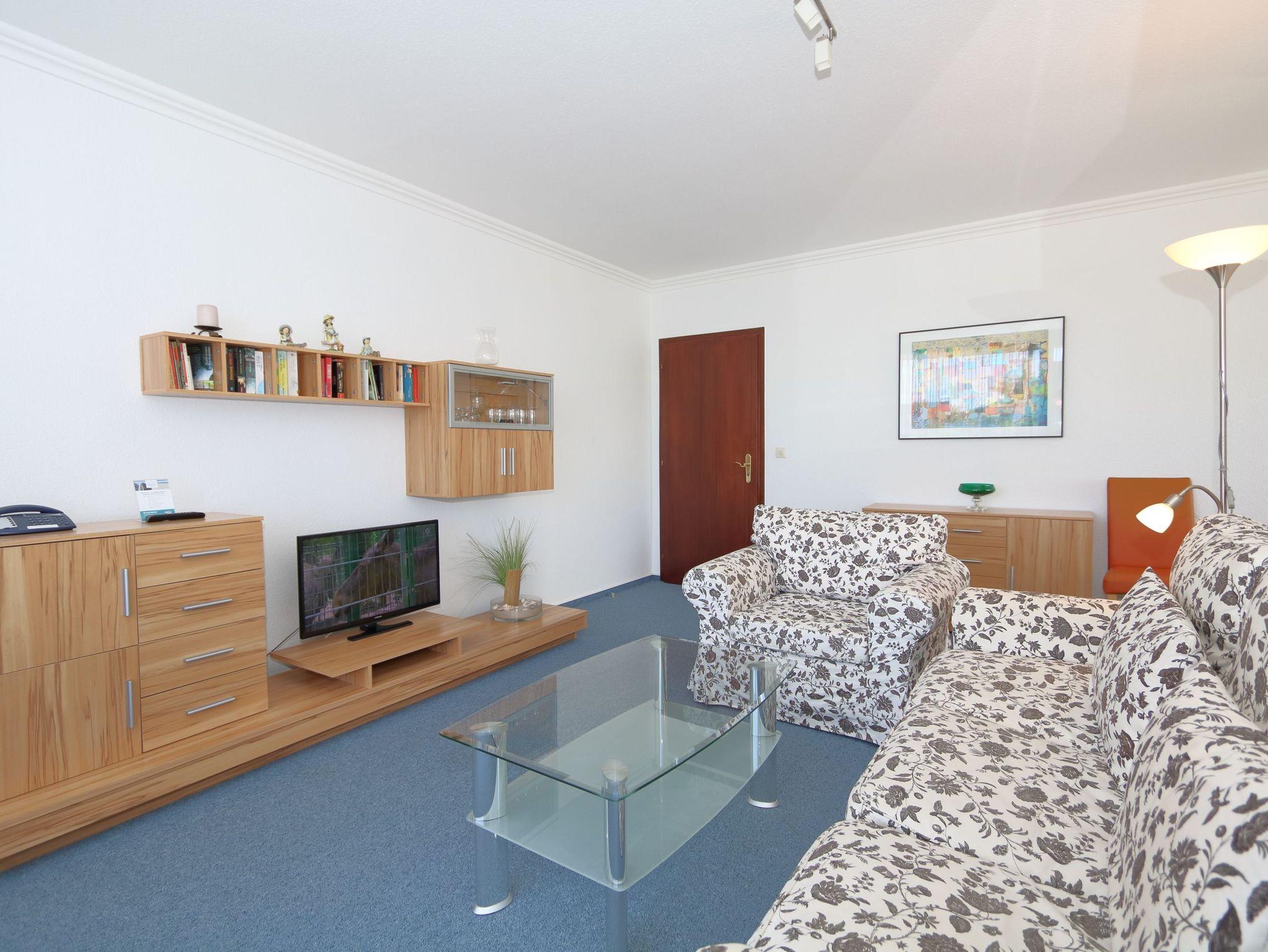 Im Wohnzimmer steht eine große, gemütliche Couch, die sich zu einer bequemen Schlafgelegenheit ausziehen lässt. Vom Wohnzimmer aus offen zugänglich befindet sich die Küchenzeile (mit u. a. Mikrowelle und Spülmaschine) und dem am Fenster stehenden Essplatz. Das Schlafzimmer hat ein Doppelbett (2x90x200cm). Wohnzimmer und Schlafzimmer sind mit Teppichboden ausgelegt. Vor dem Wohnzimmer befindet sich der große Westbalkon mit entsprechenden Balkonmöbeln. Kabel-TV, Telefon und WLan sind vorhanden.