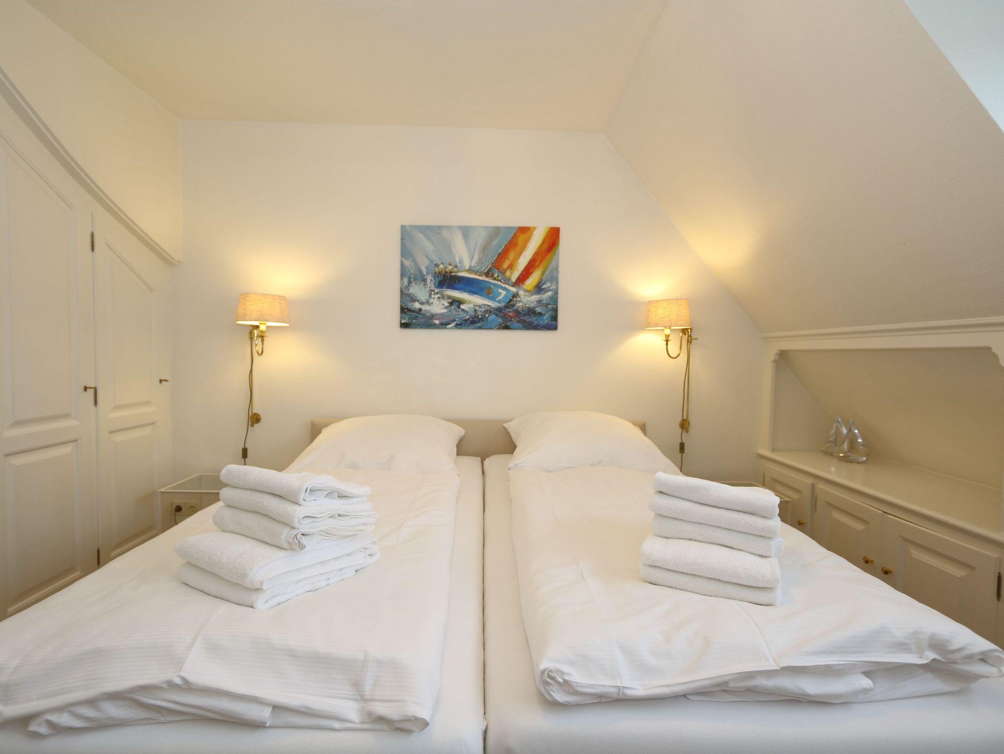 Weiterhin gibt es im Haus zwei Schlafzimmer mit Doppelbetten und ein Schlafzimmer mit einem Einzelbett, welches zum Treppenhaus offen ist.