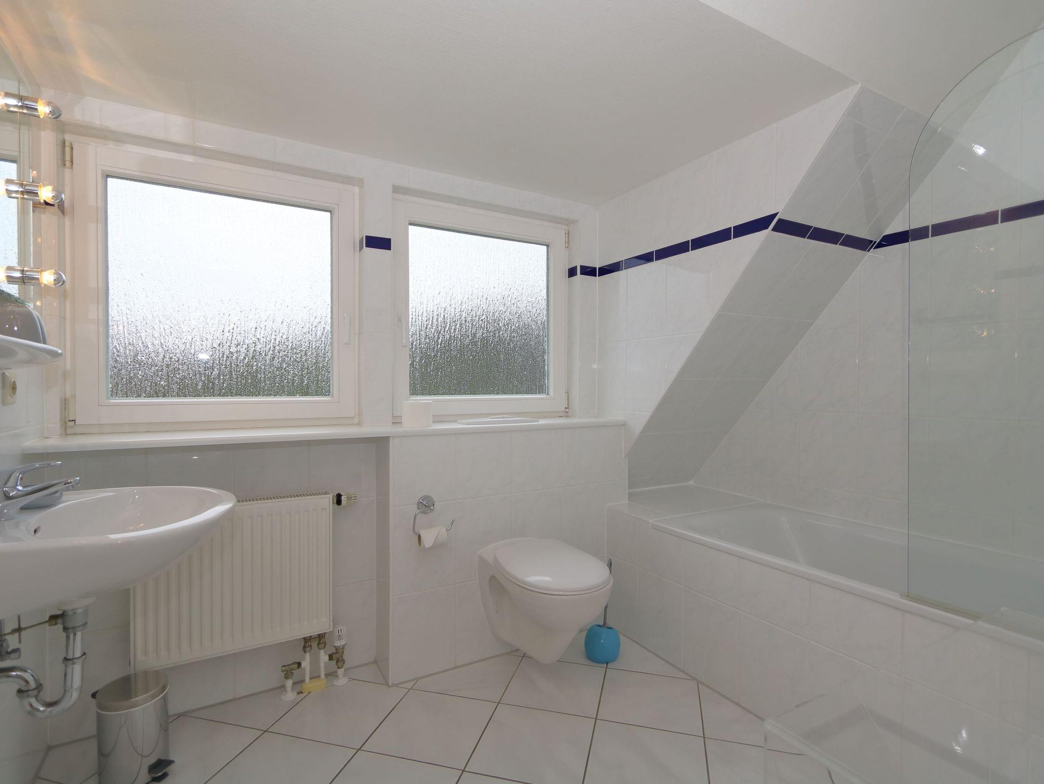 Ein Duschbad (mit Waschmaschine/Trockner) und ein Wannenbad stehen zur Verfügung.