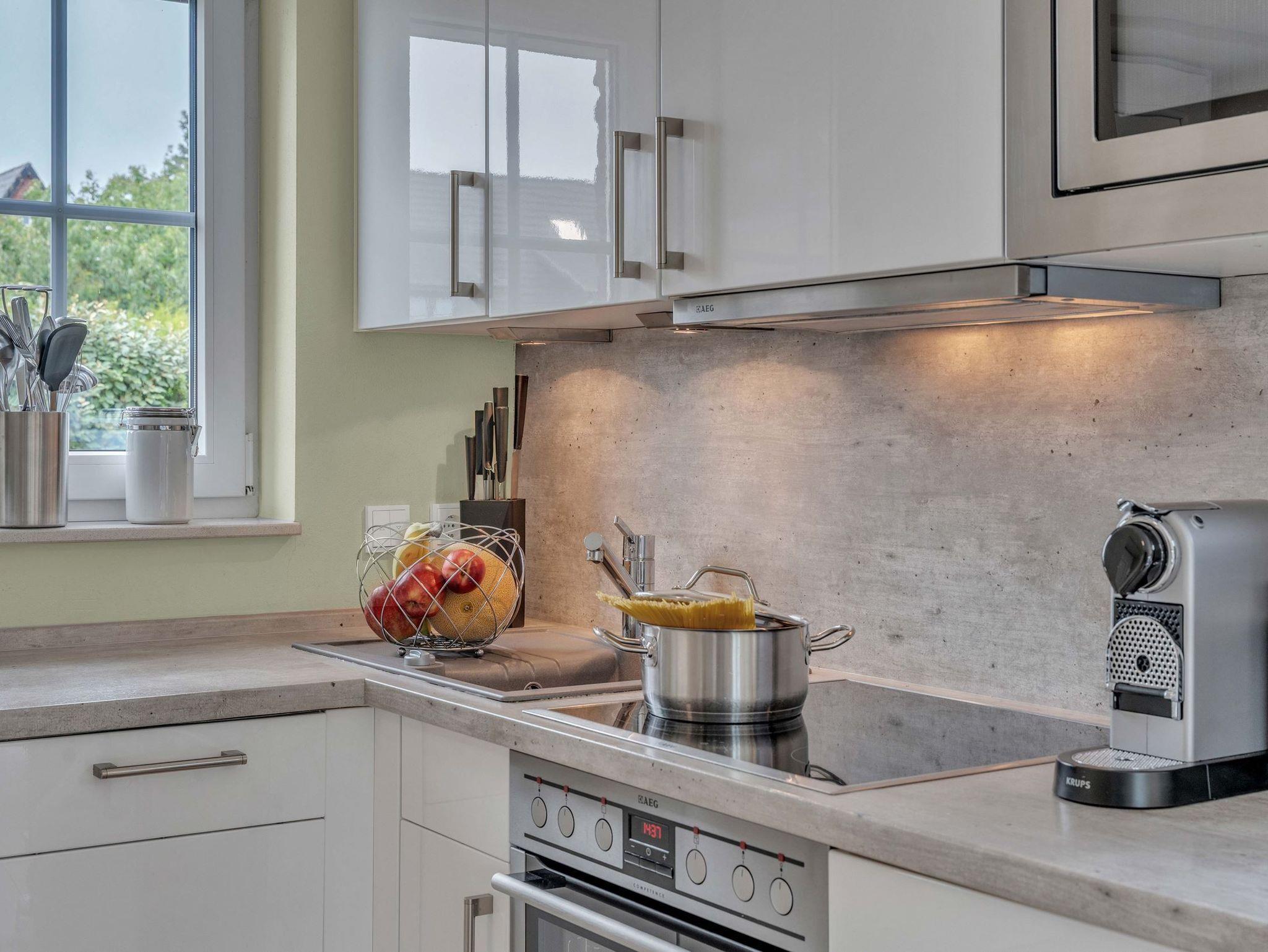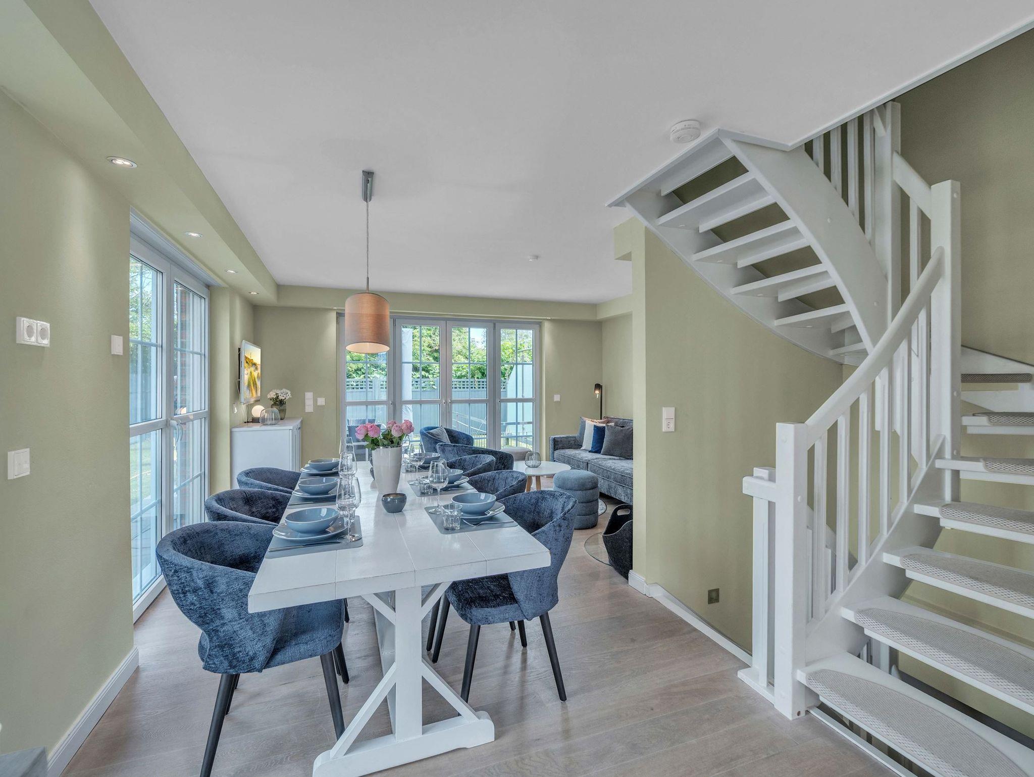 Dieses hochwertige Feriendomizil bietet Platz für bis zu 8 Personen (Empfehlung: Maximal 4 Erwachsene und 4 Kinder). Das Haus ist in einem hellen, modernen Design eingerichtet. Sie erwartet ein modernes Wohlfühl-Ambiente mit hellem Landhausdielenparkett, Flachbildfernsehern in allen Schlafzimmern, 3 wunderschönen Bädern aus Naturstein - zusätzlich eine Sauna sowie eine Whirlbadewanne. Nicht zu vergessen der Kaminofen, welcher gemütliche Abende im Wohnzimmer garantiert. Das Haus teilt sich wie folgt auf: Im Untergeschoss haben Sie ein großes Schlafzimmer mit Doppelbett (180x200xm), ein Badezimmer, sowie die Sauna. Im Erdgeschoss haben Sie ein Badezimmer mit Dusche, die große Küche, den Essbreich, sowie das Wohnzimmer. im 1. OG finden Sie ein großes Schlafzimmer mit einem Doppelbett (180x200cm), ein kleineres Schlafzimmer mit einem Kojenbett (140x200cm), sowie ein Badezimmer mit Dusche. Im Dachgeschoss finden Sie das vierte Schlafzimmer mit 2 Einzelbetten. Dies empfehlen wir aufgrund der Dachgeschrägen für Kinder empfehlen würden. Außerdem handelt es sich um eine offene Galerie.