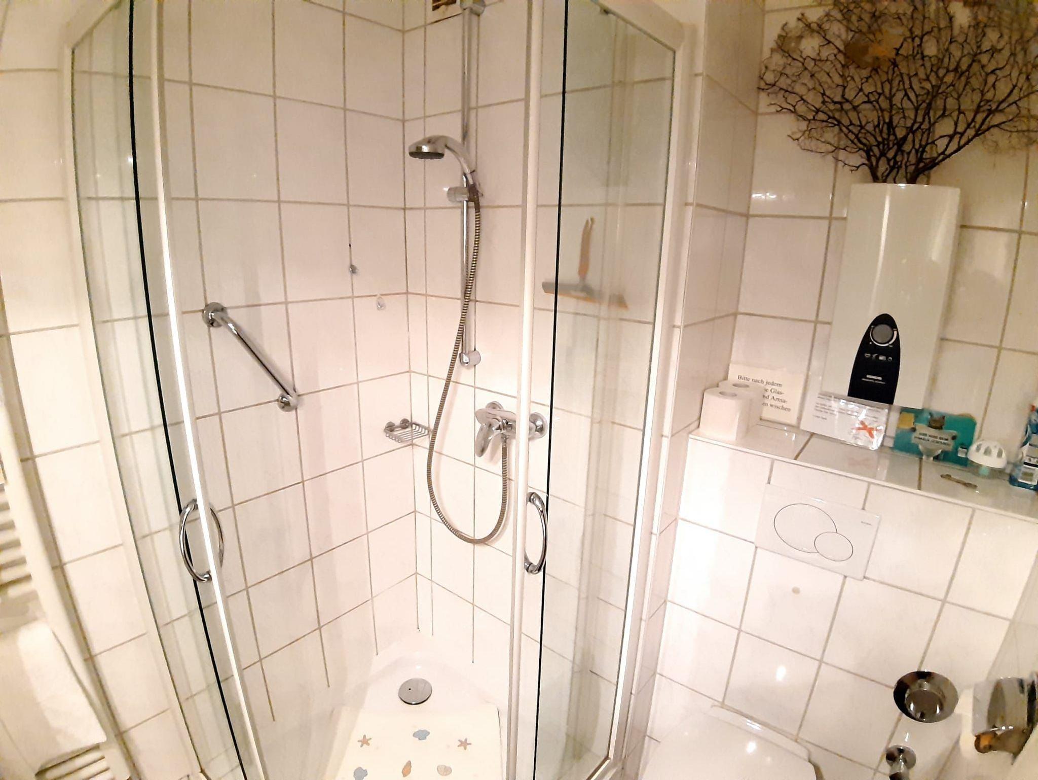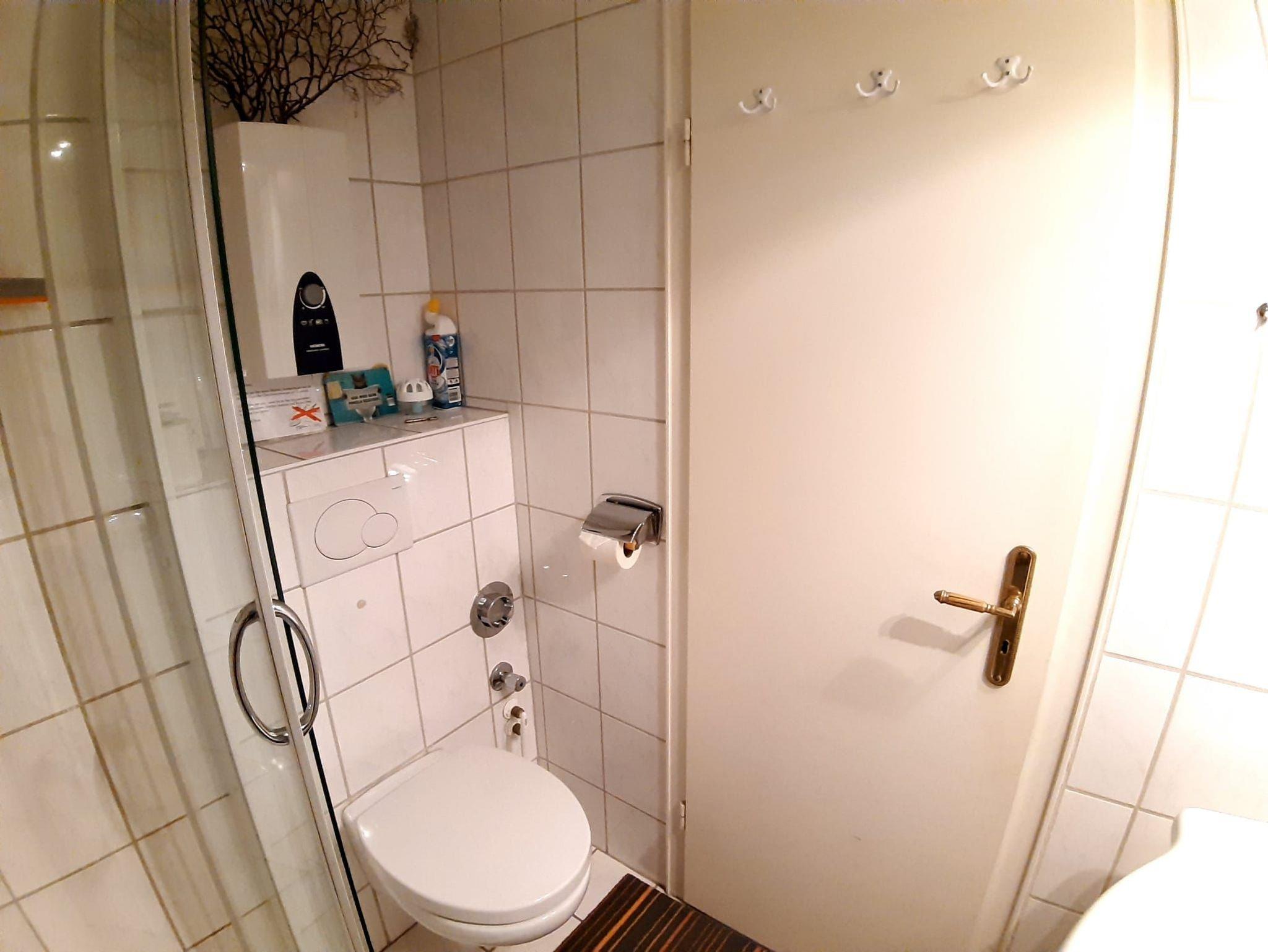 Ein Bad mit Dusche, Waschtisch, Handtuchtrockner, WC und Haartrockner.