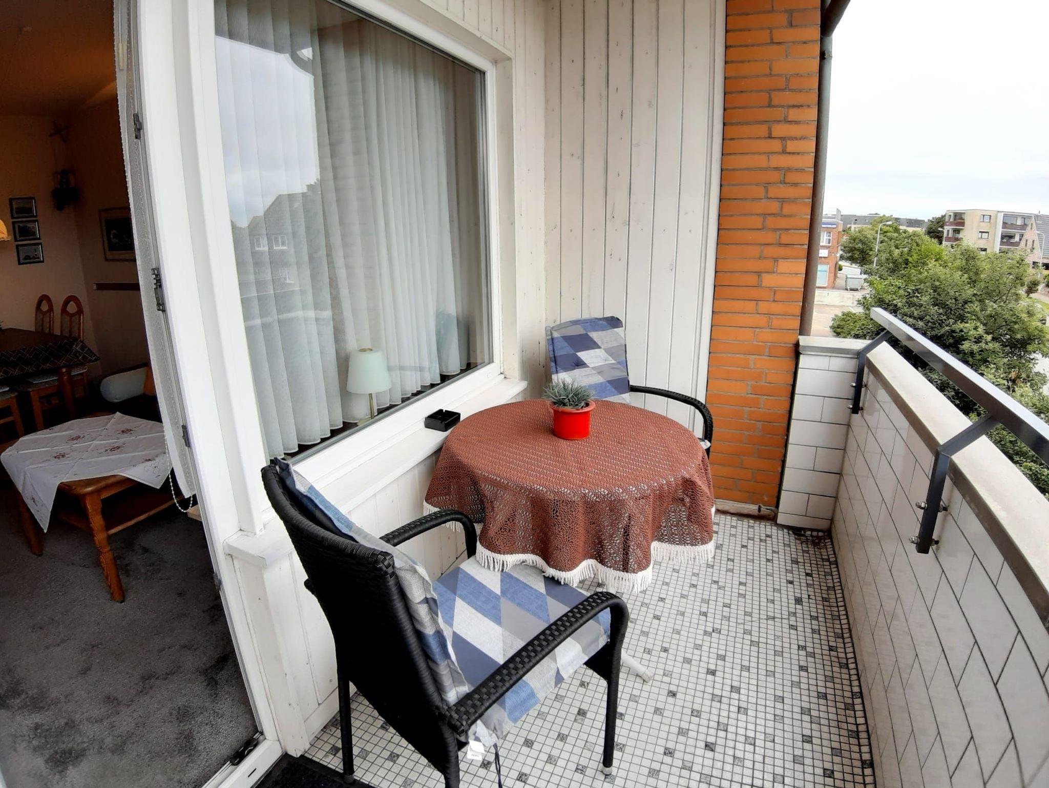 Der Balkon mit Gartenstühlen und Tisch lädt zum Verweilen ein.