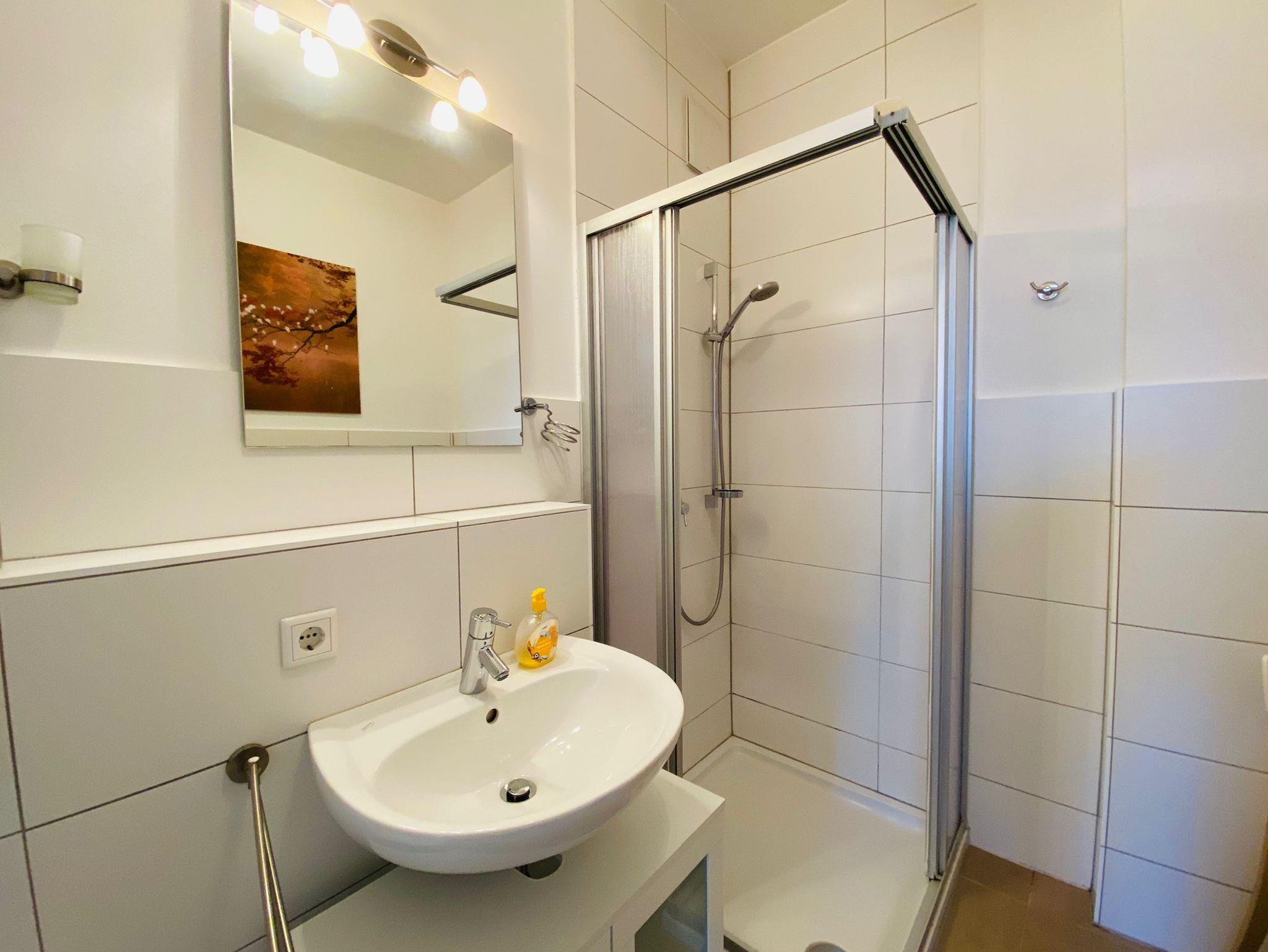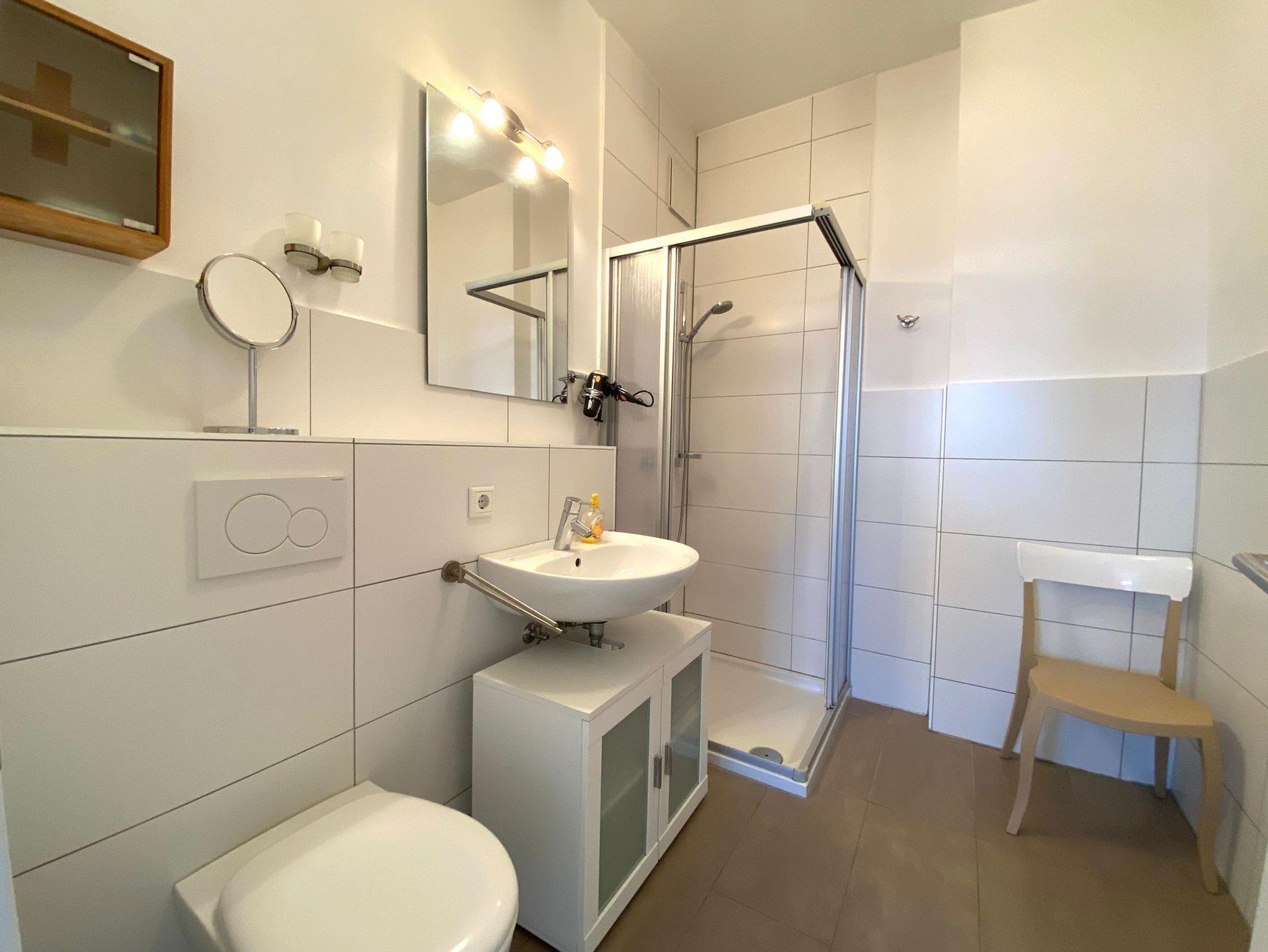 Das helle Badezimmer ist mit einer Dusche, WC, Waschbecken, Handtuchwärmer und Föhn ausgestattet.