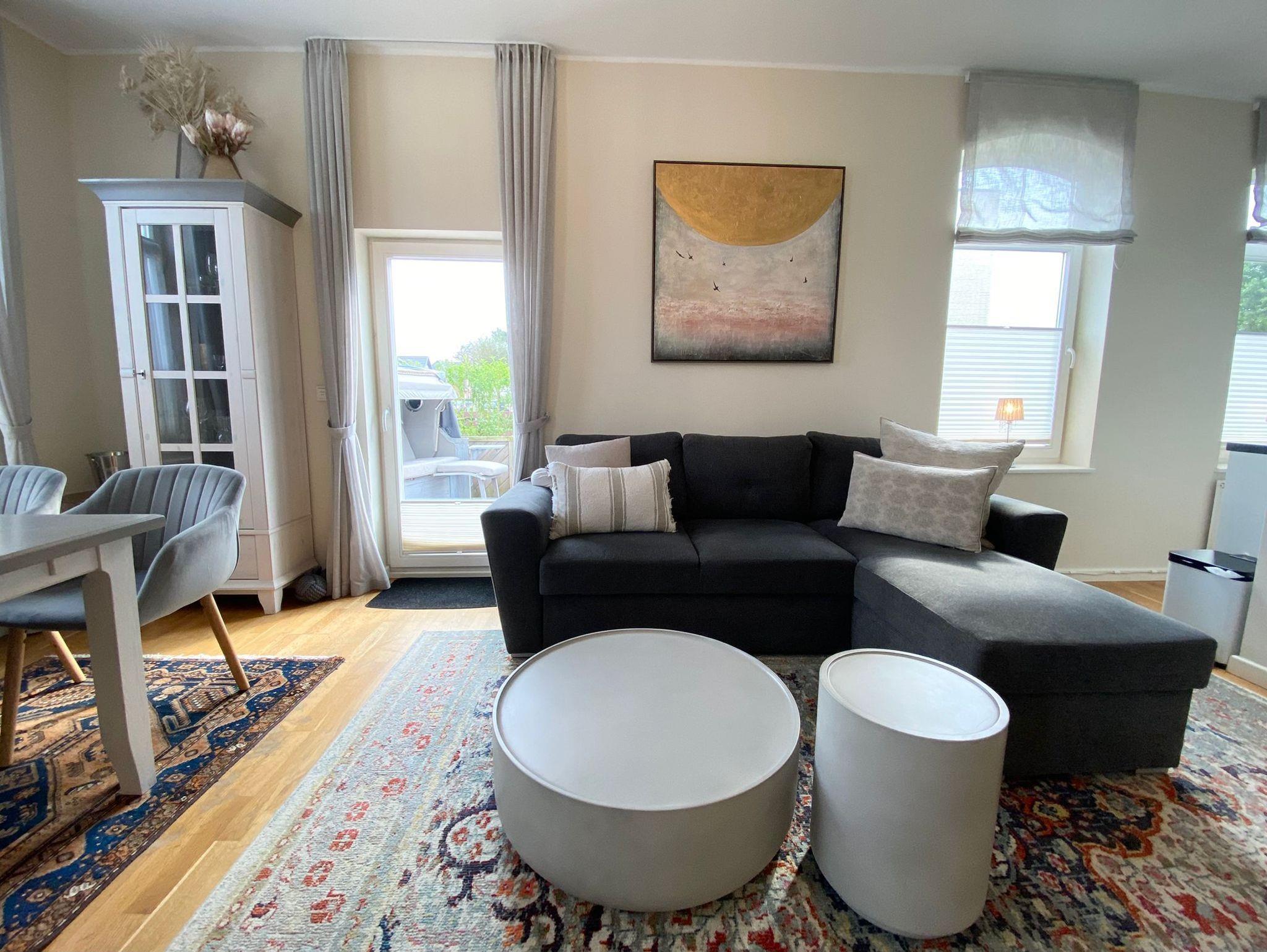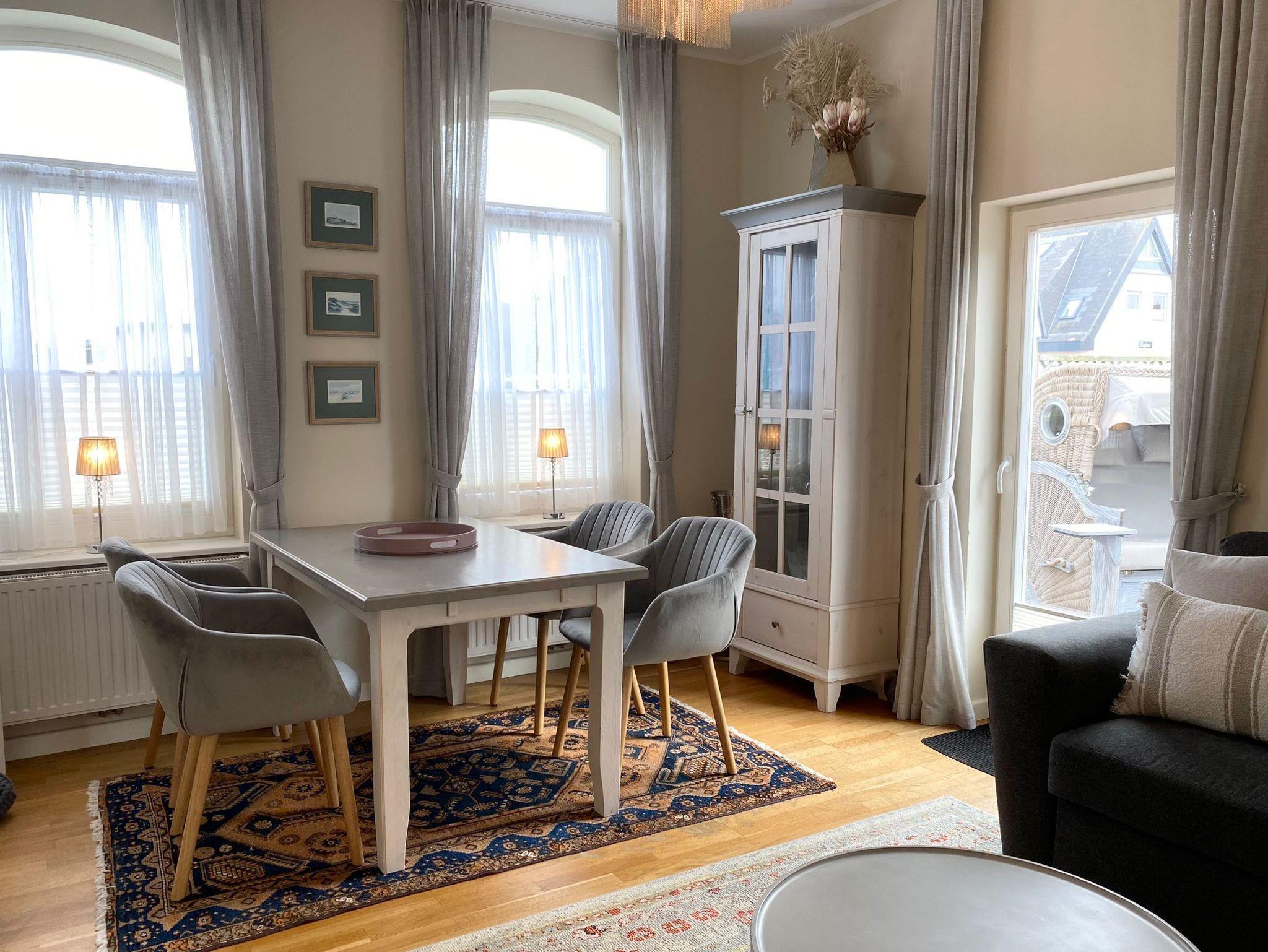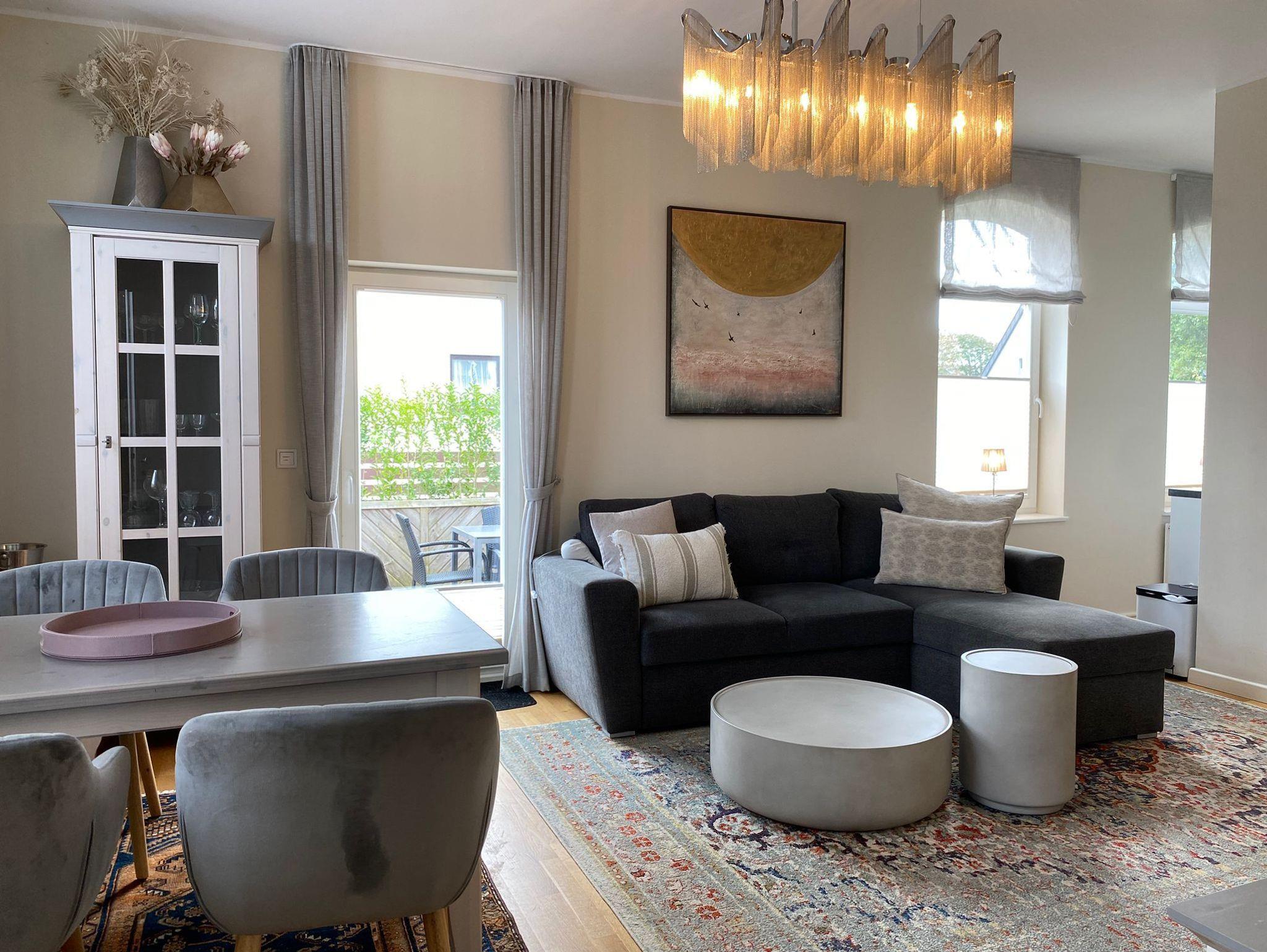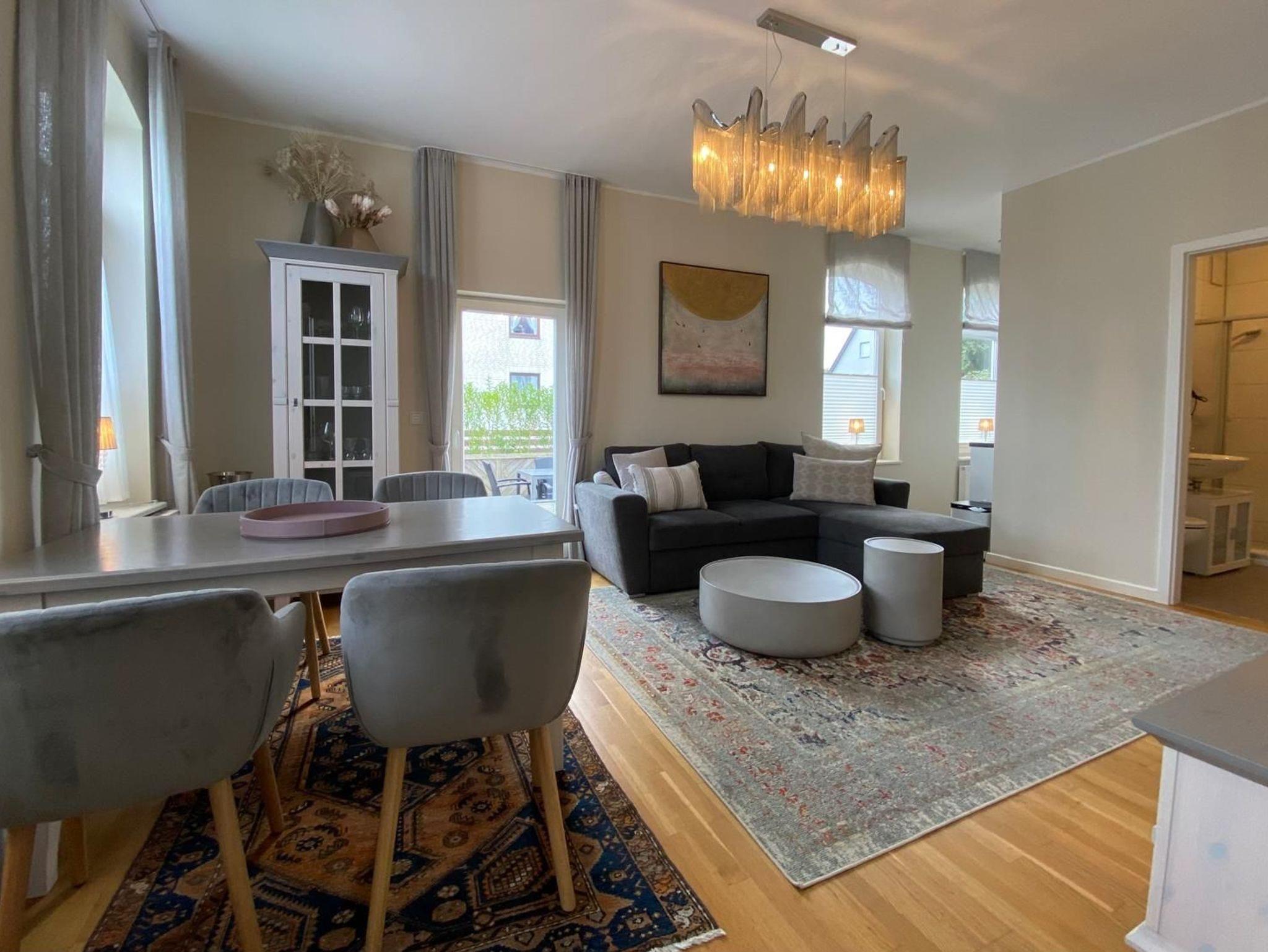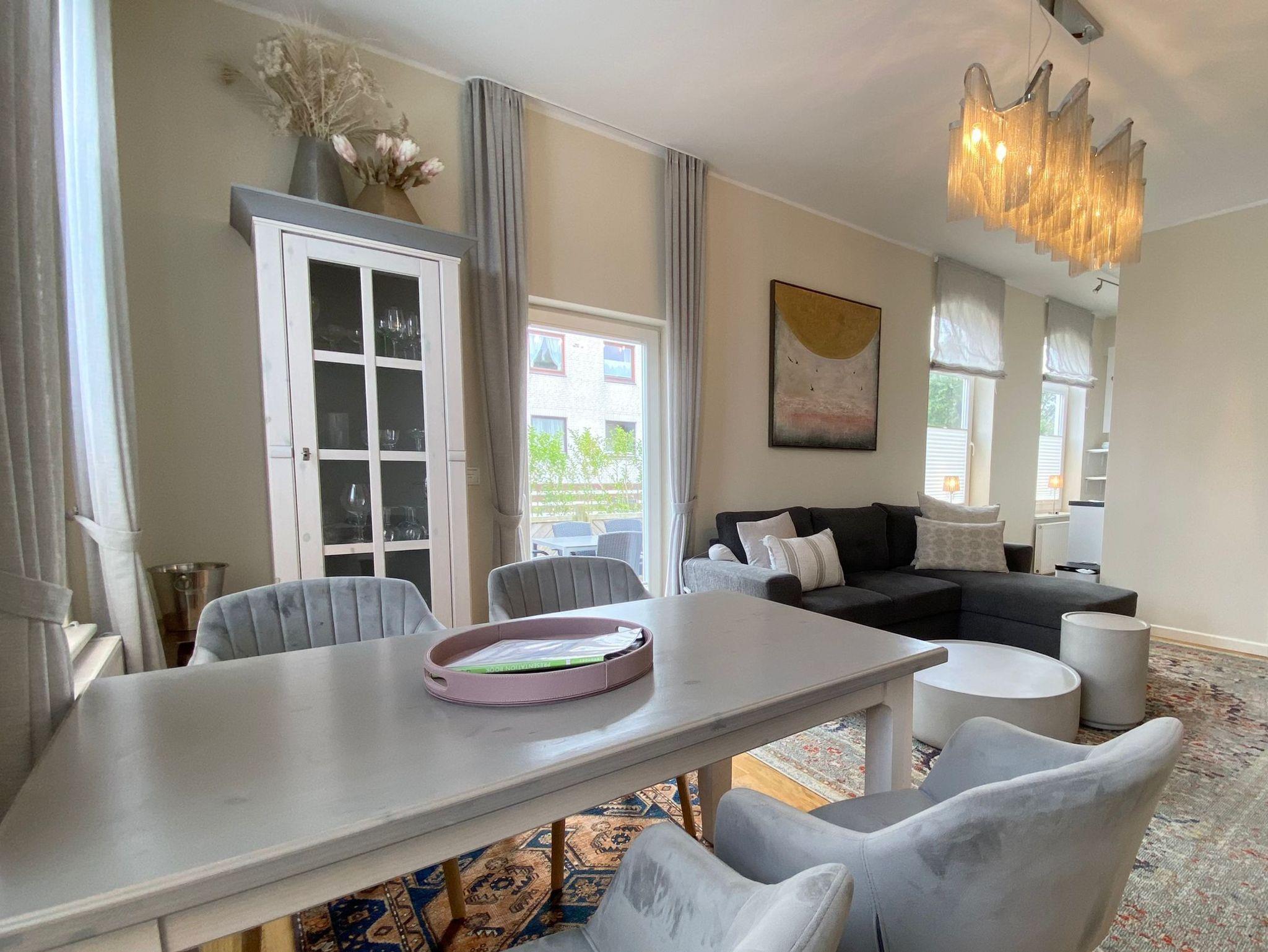 Wohn- und Essbereich: Der einladende Wohnbereich bildet den Mittelpunkt der Wohnung. Hier entspannen Sie auf der komfortablen Sitzgarnitur, genießen Filme auf dem 3D-Flachbild-TV und speisen am gemütlichen Esstisch. Profitieren Sie vom kostenlosen WLAN-Zugang.