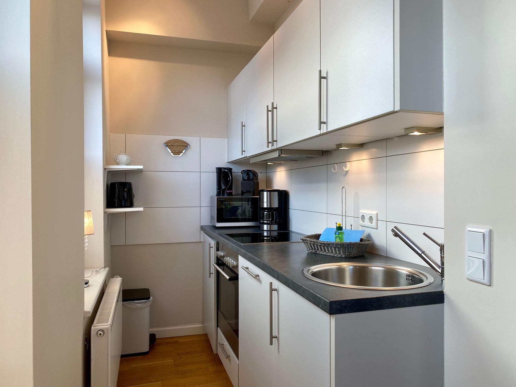 Küche: Die praktische Küchennische ist komplett ausgestattet mit einem Ceran-Kochfeld, Backofen, Geschirrspüler, Kühlschrank mit Gefrierfach, Kaffeemaschine, Wasserkocher, Toaster und Geschirr für den täglichen Bedarf. Hier können Sie bequem Ihre Mahlzeiten zubereiten.