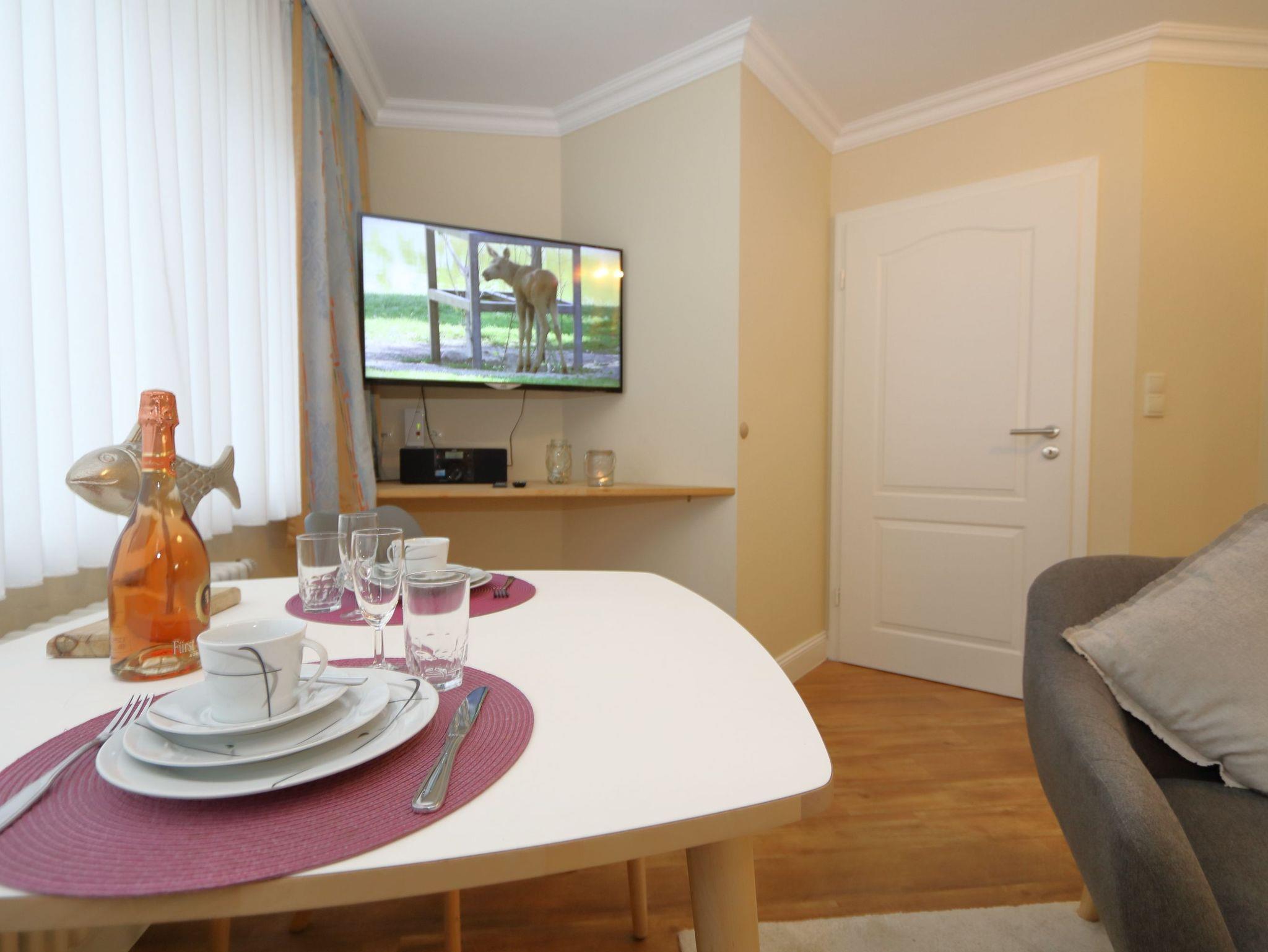 Ein großer Fernseher mit Smart-TV und ein kleines Stereoradio sorgen für Unterhaltung.